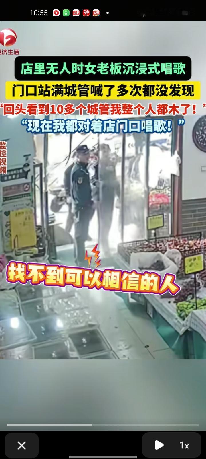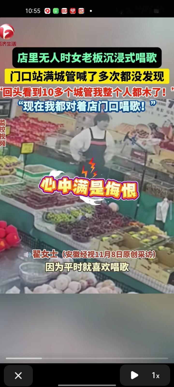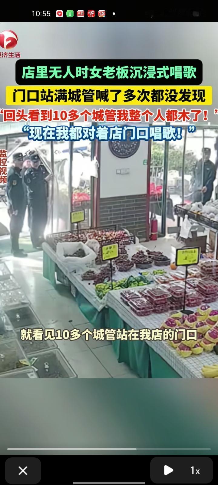 11月4日,山东济南。监控画面显示,水果店里没人来光顾,老板娘一个人在唱歌,浑然不知城管来到店门口,回头看到十多个城管,她整个人都麻了,然后现在老板娘对着店门口唱歌。