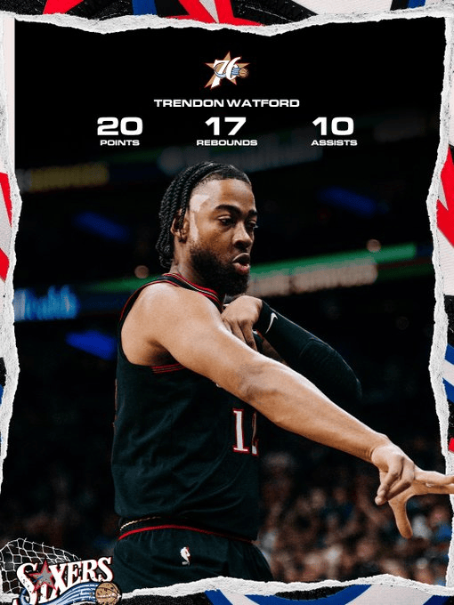 赛后,76人官方晒出沃特福德的数据海报,并附文:“特伦登生涯的首次三双!”