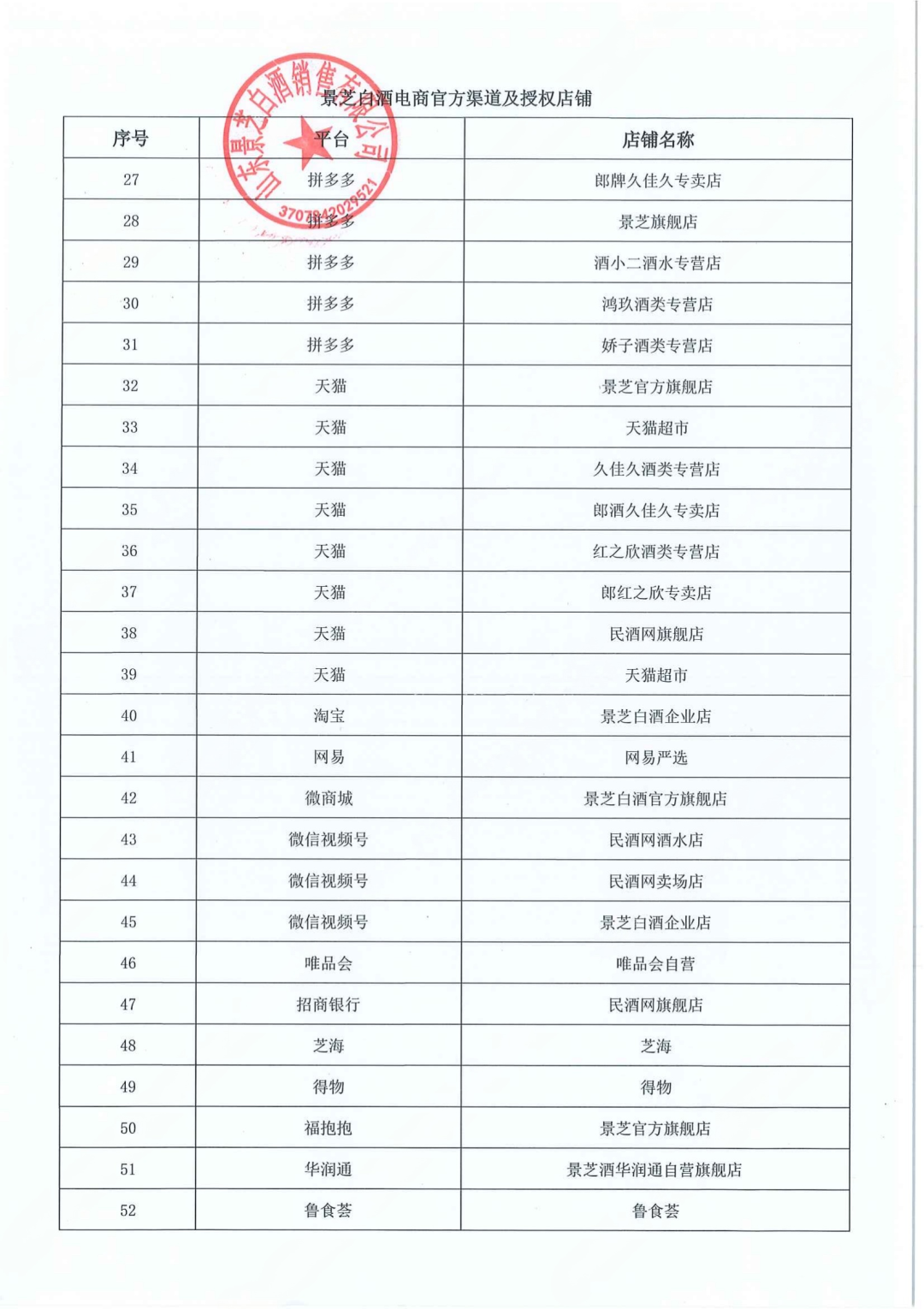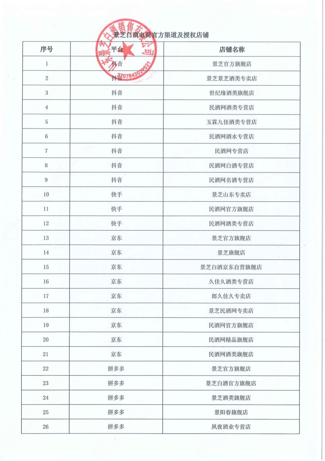 近日,山东景芝白酒销售有限公司发布消费者告知书。告知书称,公司收到诸多消费者对在抖音、拼多多等电商平台低价购买景芝、景阳春产品真假问题的咨询。经公司核实,在抖音、拼多多等电商平台除公司授权的店铺外,其他未获得公司授权认证店铺,其擅自销售的景芝、景阳春产品,往往存在产品包装破坏,相关红包、奖品等已被领取;二次包装,产品被调换,以次充好,甚至存在假冒伪劣产品的风险。为维护广大消费者权益,建议广大消费者在选购景芝、景阳春产品时,认准官方渠道与正规授权店铺。具体店铺名单如下: