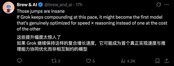 对此,有网友评论道,Grok要是照这样增长下去,「它可能成为首个真正实现速度与推理能力协同优化而非相互制约的模型」。