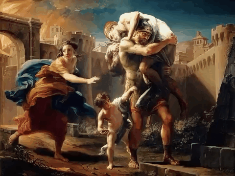 有网友还玩起了西方古典文学与神话中的经典情节——埃涅阿斯逃离特洛伊。
