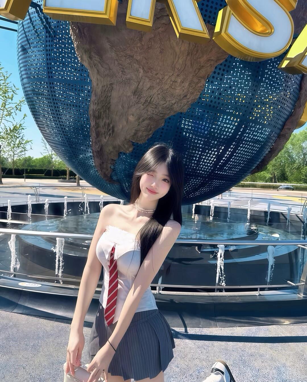 阳光明媚的一天,穿着可爱制服的少女在公园里漫步。