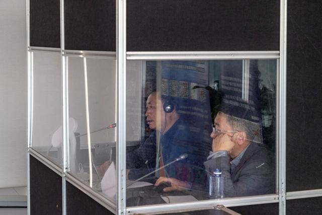 10.同传译员梅俊杰与王炎强正专注工作,文汇App直播中同时保留中文和英文频道,并供回看温故。
