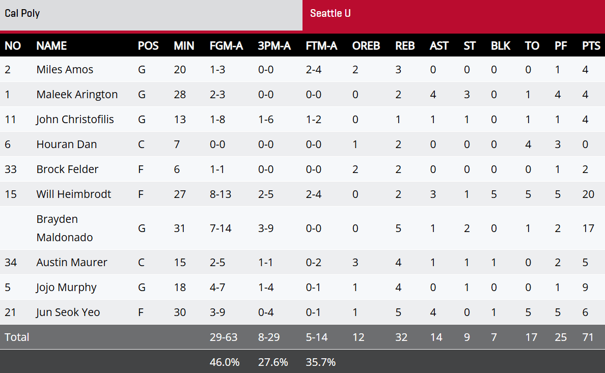 虎扑11月09日讯NCAA常规赛,西雅图大学71-73不敌加州州立理工大学。