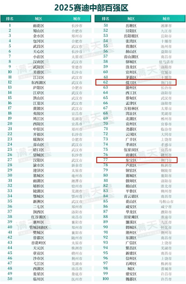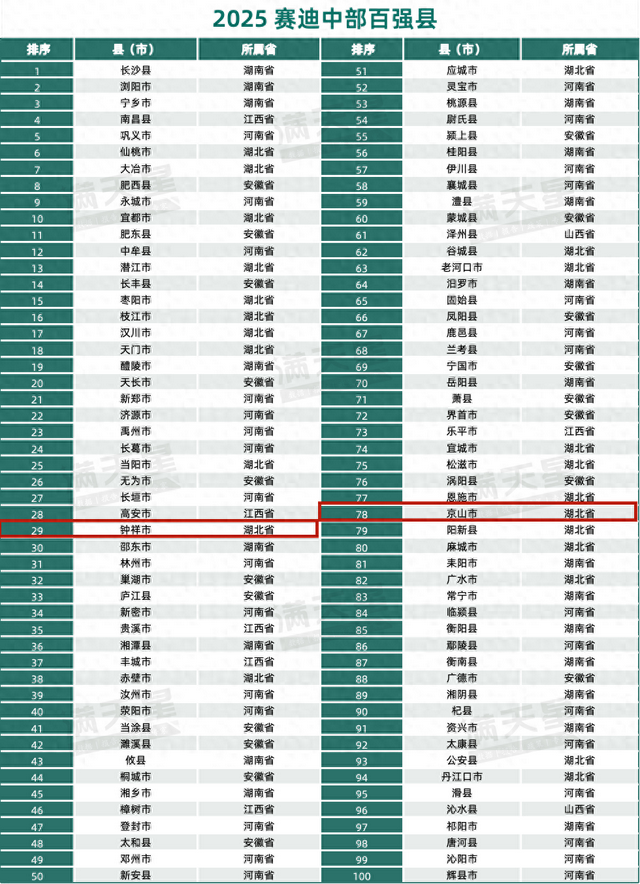 11月6日,赛迪顾问发布2025中西部县域、城区经济高质量发展研究成果,同时公布2025赛迪中部百强县、2025赛迪中部百强区等榜单。钟祥市、京山市榜上有名,位列中部百强县第29、78位。荆门市掇刀区、东宝区榜上有名,位列中部百强区第62、77位。