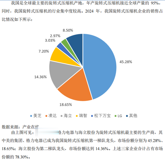 招股说明书显示,空调压缩机市场的集中度较高,美的集团、格力电器等龙头企业占据主要的市场份额,并且市场集中度呈现出逐年上升的趋势。