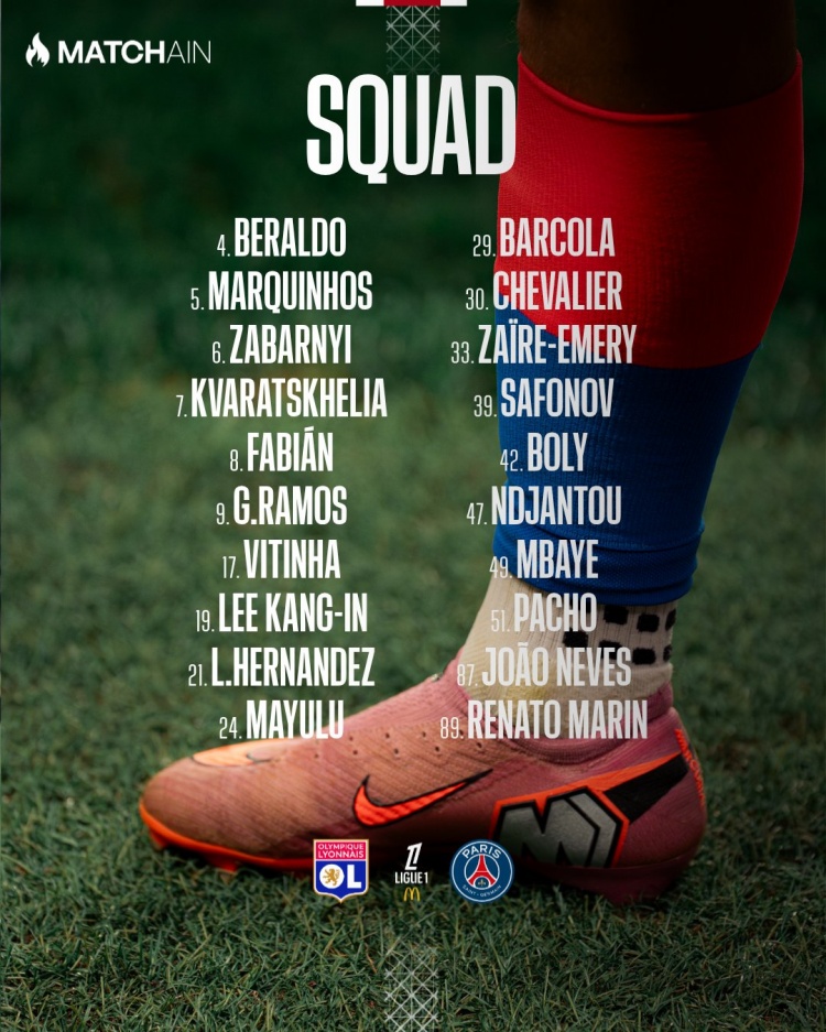 中场:8-法比安、17-维蒂尼亚、24-马尤卢、33-扎伊尔-埃梅里、87-若昂-内维斯