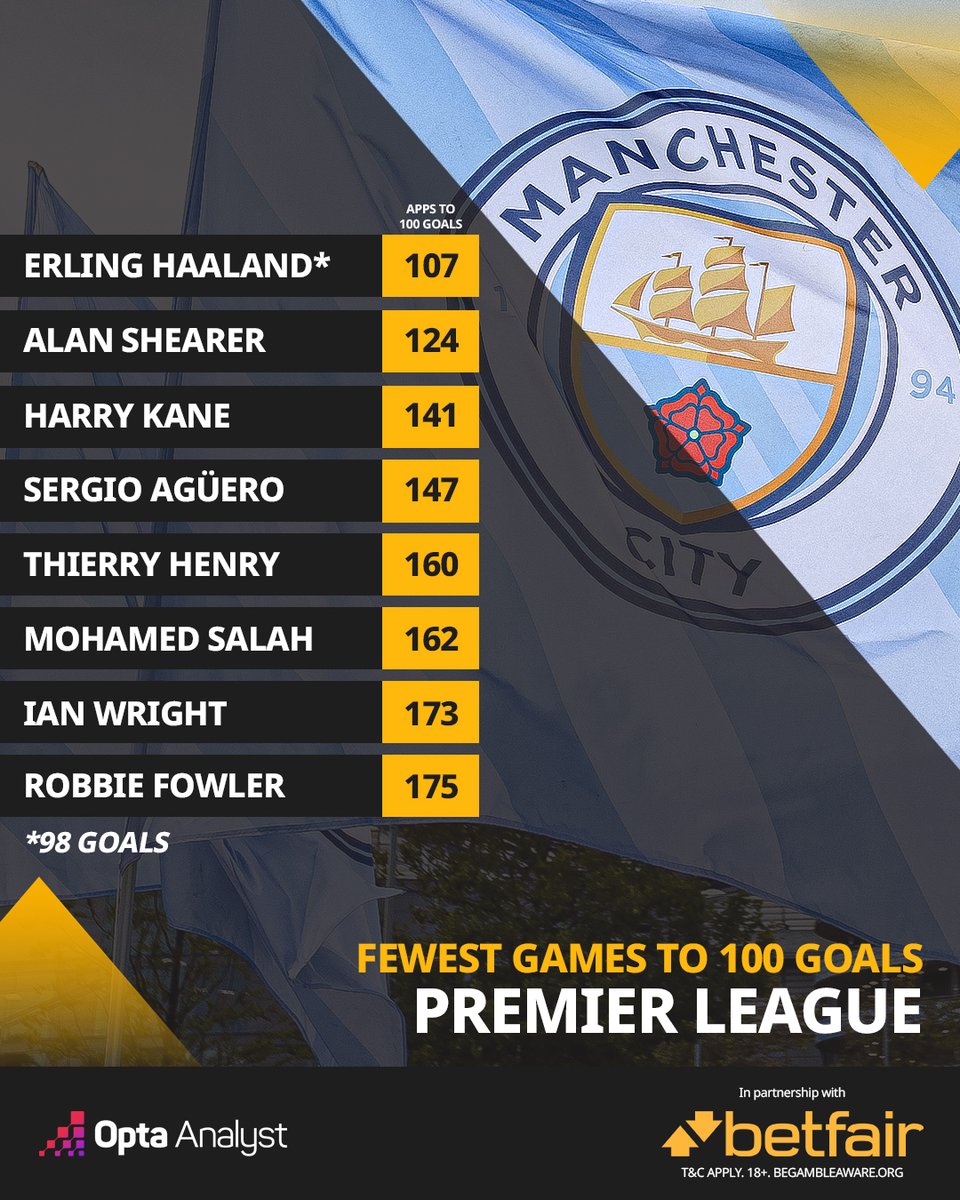 哈兰德只需接下来16场进2球,就能打破希勒英超百球纪录