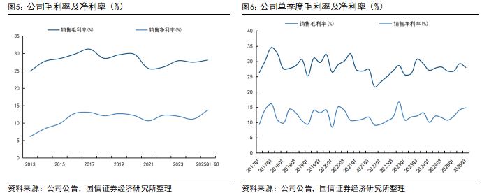 积极推进降本增效,2025Q3费用率同比下降。公司2025Q1-Q3销售毛利率28.08%,同比+0.38pct,销售净利率13.69%,同比+2.41pct;2025Q3实现销售毛利率28.02%,同比-0.14pct,环比-1.25pct,销售净利率14.82%,同比+3.23pct,环比+0.69pct,利润率提升受益于降本增效相关举措的实施。2025Q3公司销售、管理、研发、财务费用率分别为1.6%、5.5%、5.1%、-0.2%,同比-0.6pct、-2.1pct、-0.1pct、-0.9pct,环比-0.3pct、+0.4pct、+1.1pct、-0.7pct,费用率同比下降,主要由于公司积极推进降本增效取得成果。