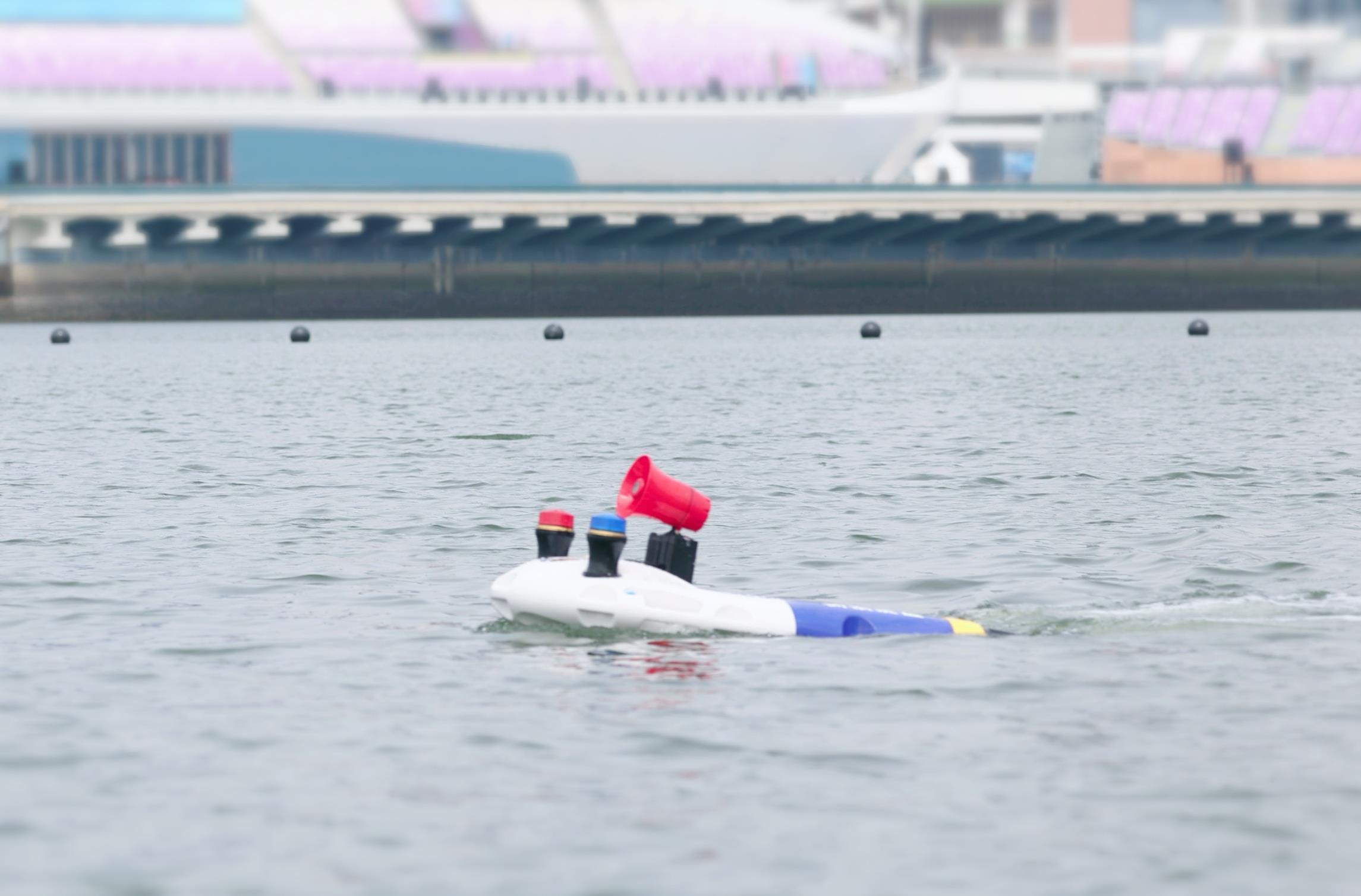 作为十五运会的闭幕式场地,深圳市宝安区欢乐剧场正在紧锣密鼓地开展筹备工作。而在附近的海面上,一个蓝白相间的U形机器人正在快速穿梭——这就是深圳宝安警方最新引入的水上海防巡逻机器人。