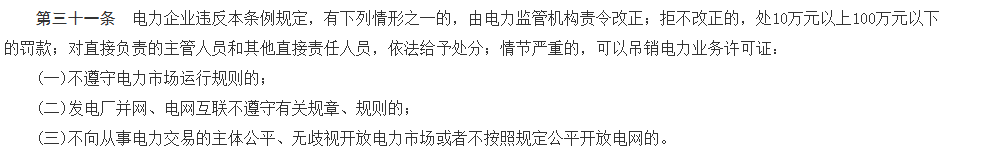 《电力监管条例》,自2005年5月1日起施行《电力监管条例》第三十一条指出:电力企业违反本条例规定,有下列情形之一的,由电力监管机构责令改正;拒不改正的,处10万元以上100万元以下的罚款;对直接负责的主管人员和其他直接责任人员,依法给予处分;情节严重的,可以吊销电力业务许可证: