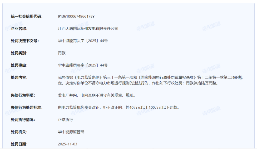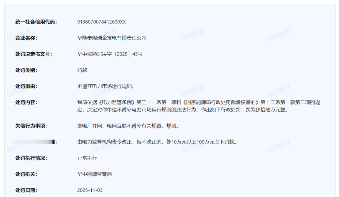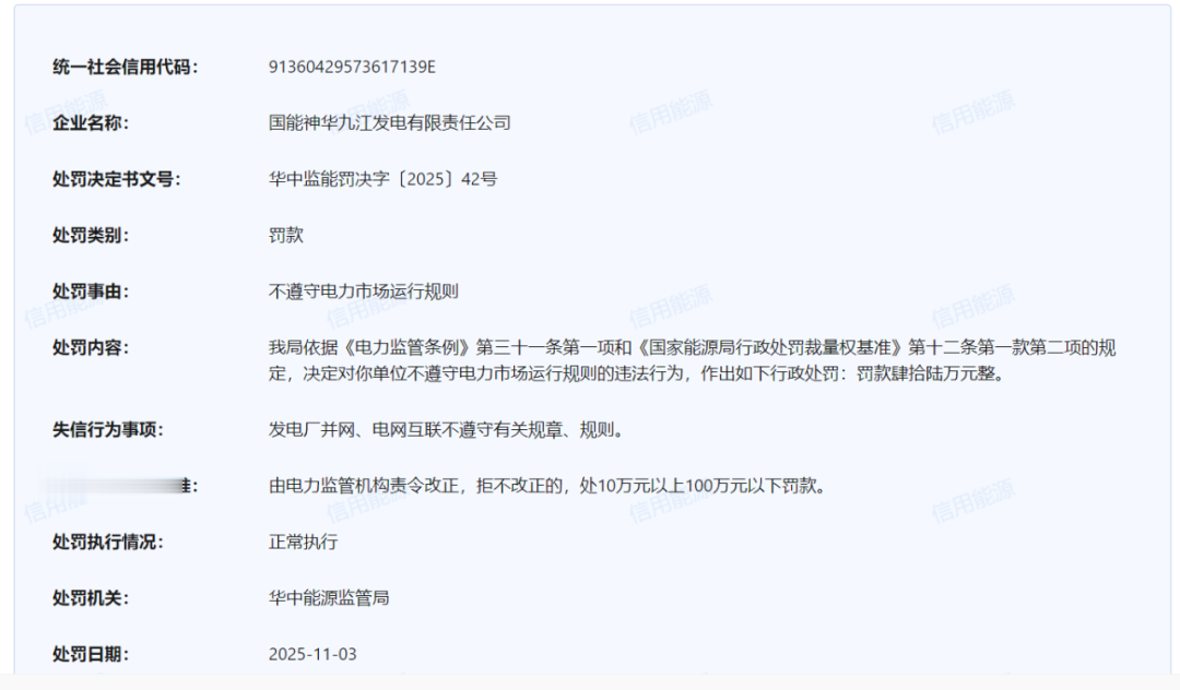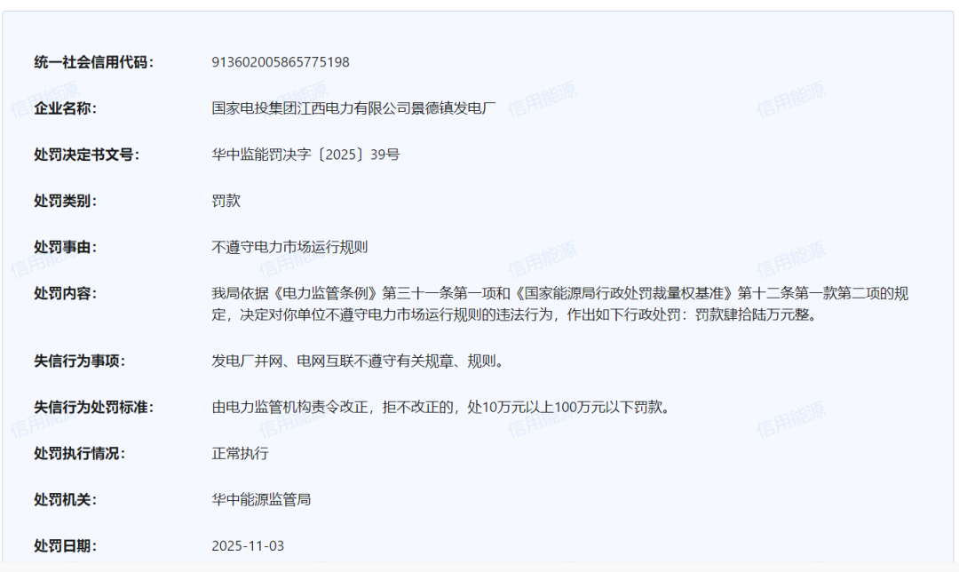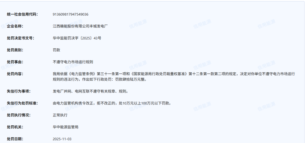 2025年11月3日,信用能源官网对外公布了针对多家发电电力企业不遵守电力市场运行规则的处罚通知。其中: