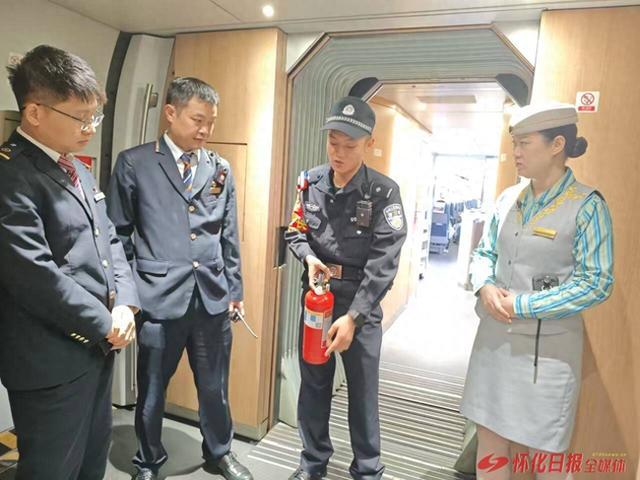在列车上,怀铁乘警向旅客们讲解列车消防安全知识,向大家介绍消防器材所在的位置和用途,并现场讲解灭火器“提、拔、握、压”的标准操作流程,并结合当前冬季用火用电形势,宣讲秋冬季节家庭消防安全注意事项,进一步提升了旅客群众的消防安全意识。