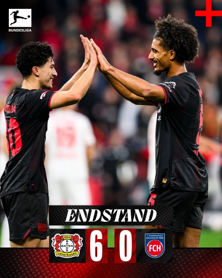 直播吧11月09日讯德甲第10轮,勒沃库森主场6-0大胜海登海姆,排名上升到积分榜第4。