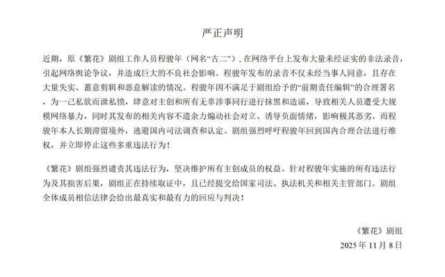 近期,原《繁花》剧组工作人员程骏年(网名“古二”),在网络平台上发布大量未经证实的非法录音,引起网络舆论争议,并造成巨大的不良社会影响。程骏年发布的录音不仅未经当事人同意,且存在大量失实、蓄意剪辑和恶意解读的情况。程骏年因不满足于剧组给予的“前期责任编辑”的合理署名,为一己私欲而泄私愤,肆意对主创和所有无辜涉事同行进行抹黑和造谣,导致相关人员遭受大规模网络暴力,同时其发布的相关内容不遗余力煽动社会对立、诱导负面情绪,影响极其恶劣。而程骏年本人长期滞留境外,逃避国内司法调查和认定。剧组强烈呼吁程骏年回到国内合理合法进行维权,并立即停止这些多重违法行为!