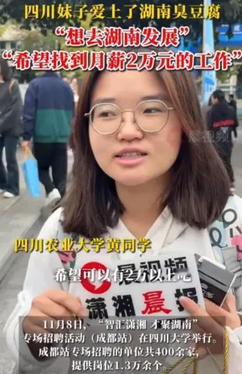 为了一口湖南臭豆腐,想去长沙闯一闯!四川农业大学女生在招聘会上喊出月薪两万的目标,瞬间炸了锅!有人笑她象牙塔里待久了,也有人叹这届年轻人不是不懂现实,而是不愿一开始就低头。 其实今年秋招,AI算法岗应届生能拿月薪4.7万,但传统行业普遍卷到5000起。不是211不值钱,而是赛道比学历更残酷。有企业明说,现在更看重实习经历和落地能力,学历只是敲门砖。 但话说回来,若连梦想都不敢提,又怎会逼自己往高处走?也许问题不在于要两万,而在于能否用实力匹配野心。就像有人调侃,先投简历再说,万一HR眼瞎呢? 理性看待薪资,但也别灭了对未来的那团火。你怎么看?评论区聊聊。