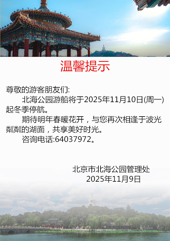 新京报讯11月9日,北京市北海公园管理处发布关于2025年游船冬季停航的温馨提示,内容如下: