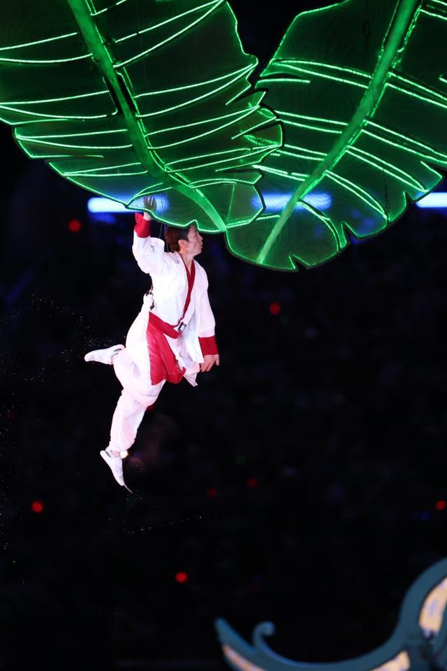 作为武术演员,谢苗是第一次参与这种大型开幕式表演,他坦言,现场演出与影视拍摄很不一样,“现场演出要精准到每一秒的动作,不容失误。但在拍戏的过程当中,我们可以不停地重复。”在此次开幕式中,谢苗主要负责武术表演中的威亚动作表演,“现场是用机器来操控威亚的,必须把握好挂钩子、摘钩子的时机。表演过程中我的神经一直很紧绷,随时准备应对各种突发情况。”这种一分一毫都不容有失的压力对谢苗来说比拍戏要大得多,不过他凭借过往的威亚控制经验应对了这一挑战。对他来说,还有一个难点在于适应场地的规模和氛围。“我第一次来到这个体育场,才发觉原来场地这么大、人这么多!怎么才能‘hold’住这个场子,对我来说是非常重要的。除了武术动作本身,我觉得还需要表演出气势。”