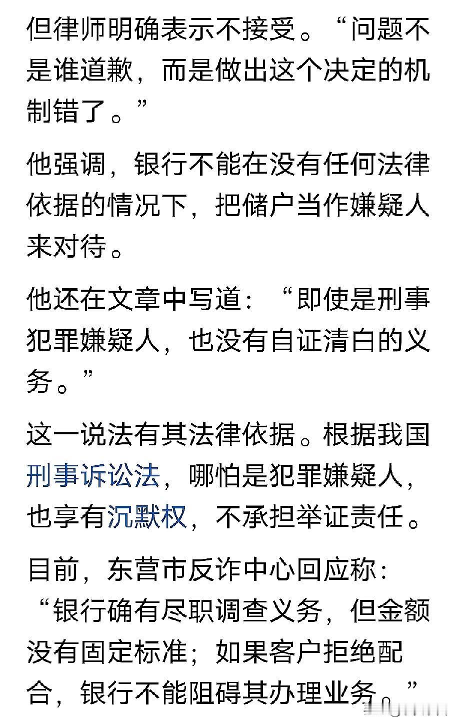 取款要报备,存款不问来源,律师解读银行霸王条款 谁能想到,一位律师在银行取款时会被柜员盘问资金用途、追问转账来源,甚至银行还拨打了反诈电话报警。 出差随礼取现金,竟遭银行反复盘问还报警?近日周筱赟律师的取款经历,戳中了不少网友的痛点。不足5万元的正当取款需求,却因“1万元以上需说明用途”的规定被层层阻拦,这场发生在建设银行东营某支行的风波,让“反诈边界”成为热议焦点。 据当事人描述,他携带身份证办理柜台取款,流程本无异常,直到说明取款用途为朋友结婚随礼后,柜员便开启了连环追问。更令人费解的是,柜员直言这是东营市反诈中心的统一要求,1万元以上取款必须报备来源和用途,超5万元还需提前预约。即便周律师当场质疑合理性,银行仍坚持“按规定办事”,甚至拨打了反诈中心和派出所电话,让正常取款变成了“接受调查”。 柜台:“你取这些钱干嘛?是买什么东西?是还贷款吗?还是给谁转账?”柜员问得很细。 不仅如此,柜员还翻阅账户记录:柜台:“上个月的某月某日,有个叫某某某的人给你转了若干元,这笔钱是什么?” 但这一“规定”与现行政策明显相悖。新规早已取消“5万元以上取款需说明用途”的硬性要求,明确金融机构应秉持“风险为导向”原则,而非设置固定金额门槛。也就是说,只有当客户账户交易出现异常风险时,银行才需开展尽职调查,而非对所有正常取款“一刀切”盘问。 事件发酵后,网友看法两极分化。支持者认为银行谨慎操作是反诈必要举措,毕竟电信诈骗手段层出不穷;反对者则吐槽“存钱自由,取钱咋就这么难”,质疑合法财产权为何要被过度限制。有网友分享类似经历:“上次取3万元装修款,被问得像审犯人,连装修公司名字都要报备”,道出了普通储户的无奈。 反诈的初衷是保护群众财产安全,但不能以牺牲合法权益为代价。银行作为金融机构,既要履行反诈责任,更要保障储户的正常存取款权利。“一刀切”的金额限制,不仅违背政策精神,更会让反诈失去民心。 真正有效的反诈,应是精准识别风险而非机械设限。银行可通过大数据监测异常交易,对频繁大额转账、异地非常规取款等情况重点核查,而非对结婚随礼、装修备货等正当需求层层设卡。守住反诈底线的同时,也该给合法交易留足空间,这才是政策制定的初衷,也是民众真正需要的安全与便利。
