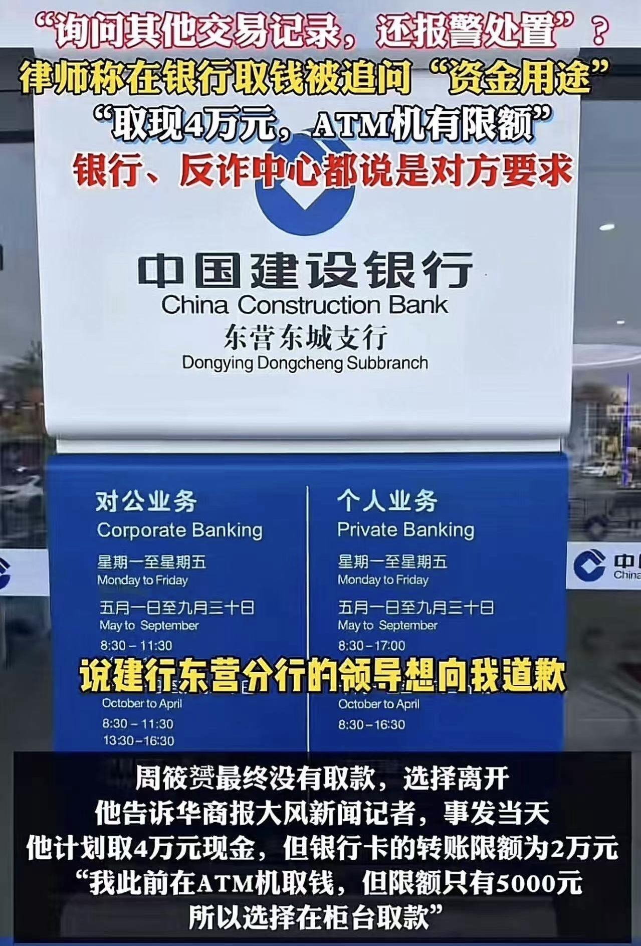 “银行这次碰到硬茬了!”山东东营,律师去银行取4万现金,被追问“资金用途”,律师认为这侵犯自己的隐私权,拒绝告知,银行竟然报案处置!律师这下忍不了,把这事情发到了网上,银行领导低头道歉,但律师觉得事情还没完…… 律师周筱赟,作为法律界具有一定声望和专业素养的人士,近期在山东东营出差期间遇到了一次令人震惊的事件。由于个人私事急需现金,他于11月3日前往当地一家中国建设银行东营东城支行办理取款手续。 他原以为这只是一次普通的银行操作,却没想到会陷入一场意料之外的“风波”。 当他到达柜台,表达出需要提取4万元现金的意愿时,柜员的态度变得异常强硬,要求他详细说明资金的具体用途。对此,周筱赟心中不满,觉得这是对个人隐私的无理盘问,银行没有权利对他进行如此审查。 他质问柜员:“这是哪条规定?凭什么让我说明资金用途?”柜员则坚称:“这是反诈中心的规定,凡是超过一万元的取款,都必须说明用途,甚至还要核实你的前期交易记录。” 身为法律专业人士,周筱赟立即意识到银行的行为涉嫌侵犯个人隐私权,可能违反相关法律法规。他坚决拒绝提供资金用途信息,并与柜员展开了激烈的争执。 他强调:“我买什么、用钱干什么,和银行没有关系,你们没有权利干涉我的私人事务。”然而,柜员坚持称他拒绝配合已被记录,并声称已向有关部门报案。 当时,周筱赟正着急用钱,经过一番思考后,决定妥协,向对方披露了部分私人信息。谁料,系统显示没有相应的选项需要反诈中心确认,令他十分愤怒。他觉得,银行居然要用个人隐私来“证明清白”,这无异于对公民权益的公然践踏。 最终,他选择放弃取款,愤然离开银行。离开后,他心中愈发不平,觉得这事不能就此罢休,于是将事件上传网络,呼吁社会关注银行的做法。 他在网络上发表声明称:“我理解反诈的必要,但用如此繁琐甚至侵入隐私的手段,既不能有效防范诈骗,也严重侵犯了公民的隐私权。根据法律,犯罪嫌疑人没有义务自证清白,反而是公诉机关负责提供证据。银行的行为明显违背了法律原则。” 这番言论迅速引发广泛讨论,社会各界纷纷表达不同看法。 事发后,建设银行东营分行负责人得知情况,立即向周筱赟道歉,试图平息事态。但他表示,单纯的道歉无法解决根本问题,银行应当反思自身行为,避免侵犯客户权益。 他还指出:“反诈工作虽然重要,但不能以牺牲普通人权益为代价。当前一些反诈措施,如限制转账、冻结账户、频繁问询,虽然出于安全考虑,却让老百姓的正常生活变得不便甚至受损。我们应当在保障安全和尊重隐私之间找到平衡点。” 事件引起了社会的热烈讨论。有网友认为:“国家为了防范电信诈骗,要求银行询问资金用途可以理解,但不应强制执行。客户坚持不说,银行应尊重他们的意愿。”也有人指出:“银行的做法只会打击合法用户,真正的骗子随便找借口就能蒙混过关,根本起不到实质性作用。” 还有声音批评:“反诈措施变成了限制正常交易的工具,限制取款、冻结账户,像是对待罪犯一样,这严重侵害了普通民众的合法权益。” 这起事件折射出公众对个人隐私保护意识的提升,也反映出反诈措施在执行中的一些问题。银行作为服务行业,应以客户权益为核心,既要维护金融安全,也要尊重和保护客户的合法权益。 同时,相关部门在制定反诈政策时,也应考虑其合理性和科学性,避免让普通民众成为“牺牲品”。只有这样,反诈工作才能取得更好的效果,赢得公众的理解和支持。 否则,反诈行动可能会引发更多的不满和抵触情绪,反而削弱其应有的威慑力。我们应当追求一种既有效又合法的反诈方式,确保每一位公民的权益都得到应有的尊重和保障。律师 银行 取钱被查问