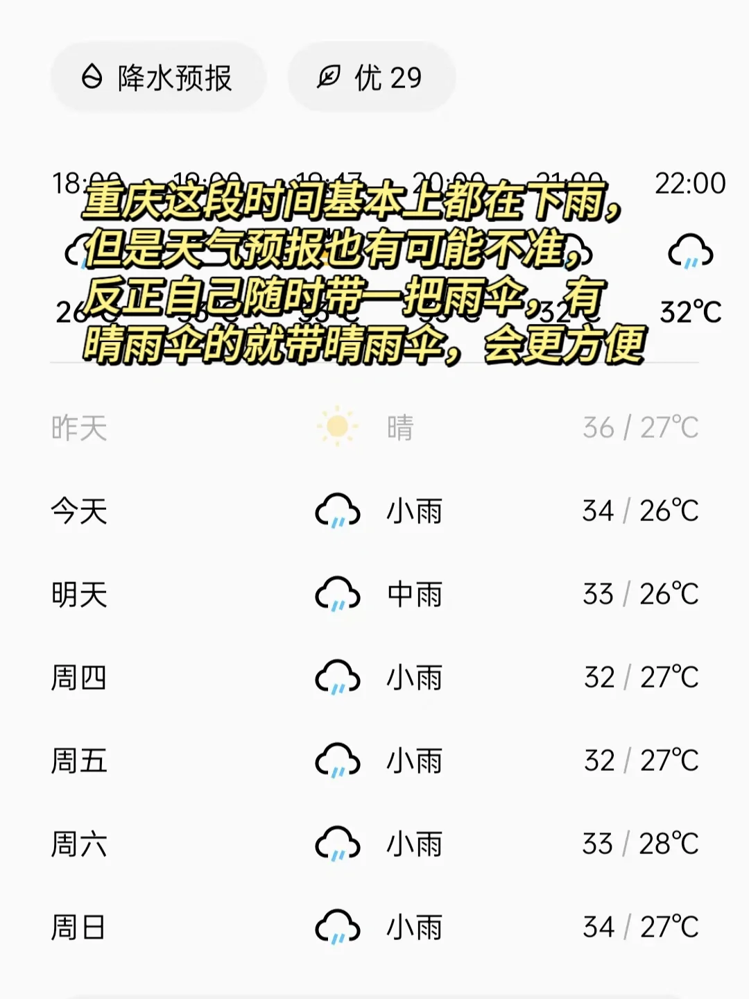 这段时间重庆的天气都不是很好,基本上连着后面几天都在下雨,不过重庆的天阴晴不定的,不能只看天气预报