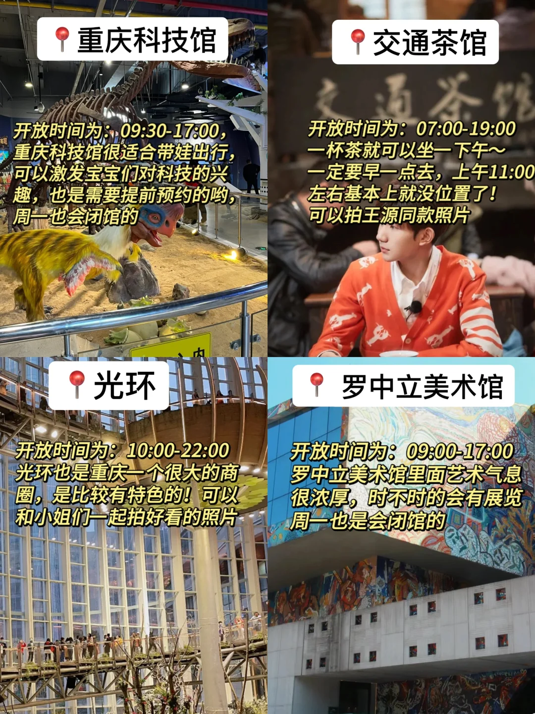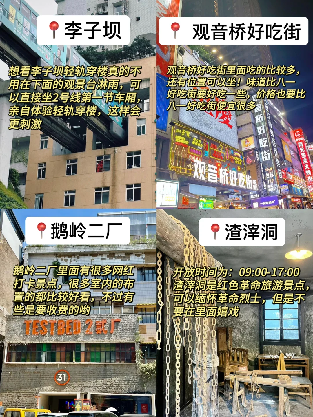 ✔️来福士、观音桥好吃街、李子坝、鹅岭二厂、渣滓洞、交通茶馆、重庆科技馆、光环购物中心、暹罗之屿