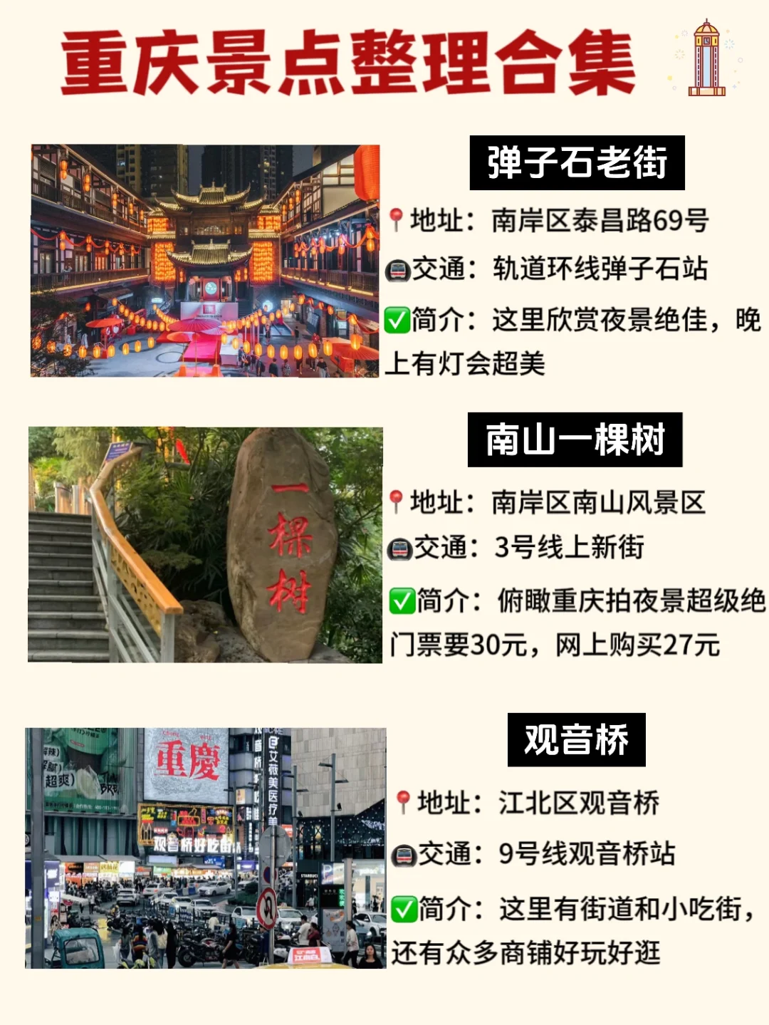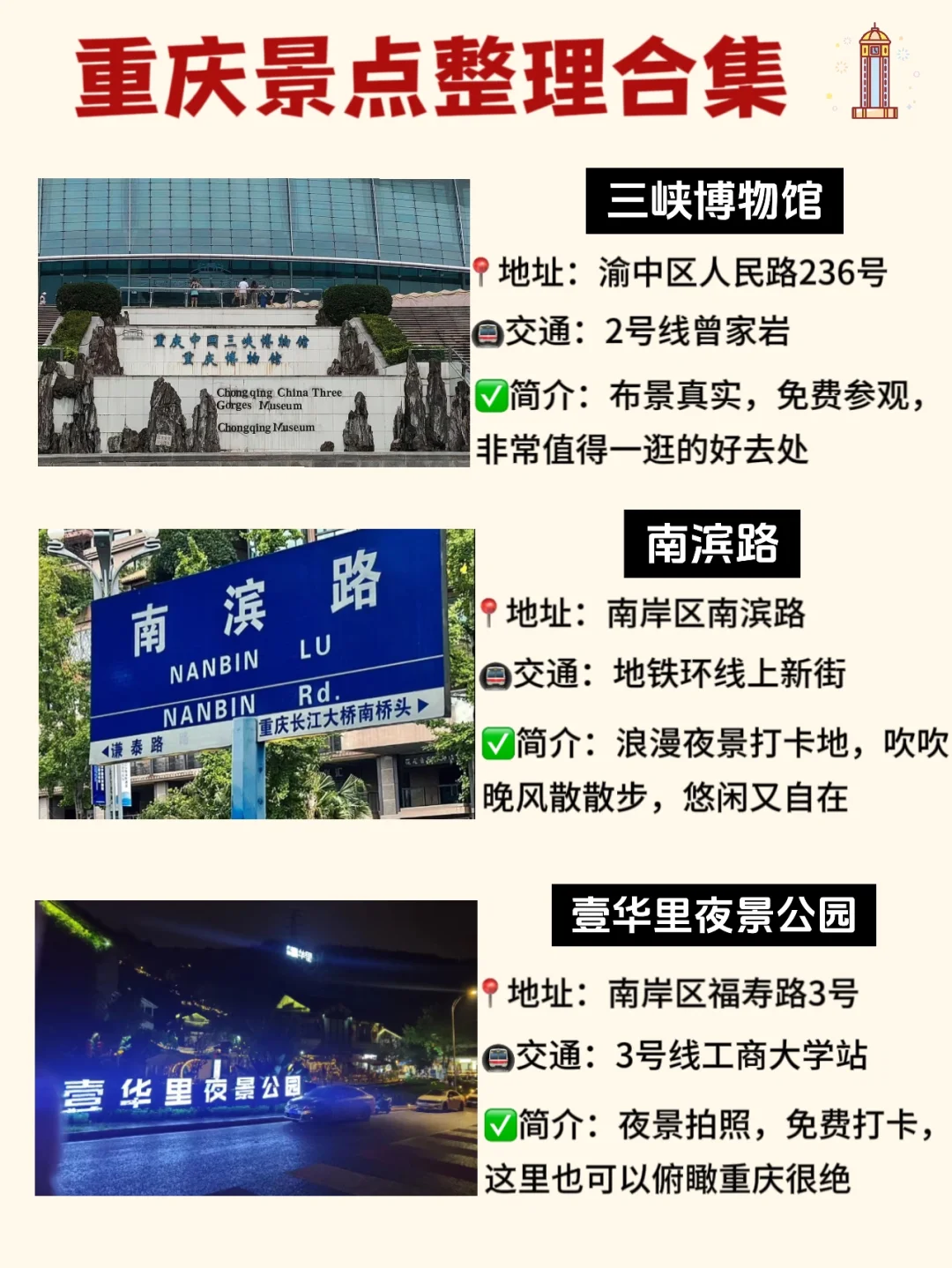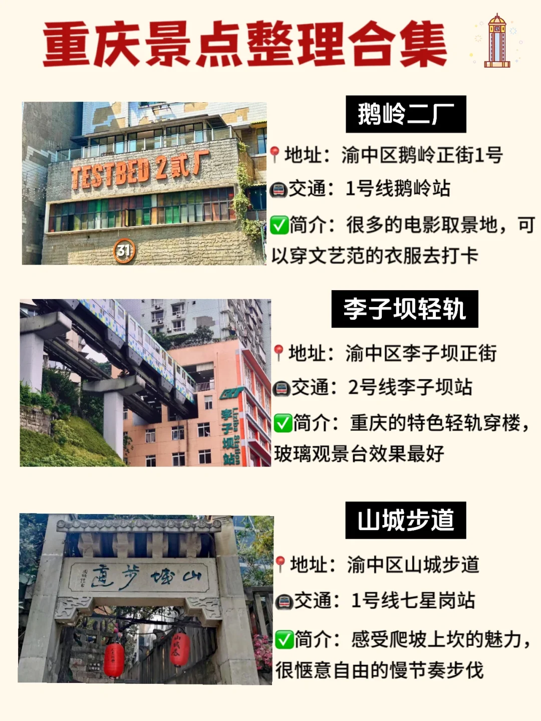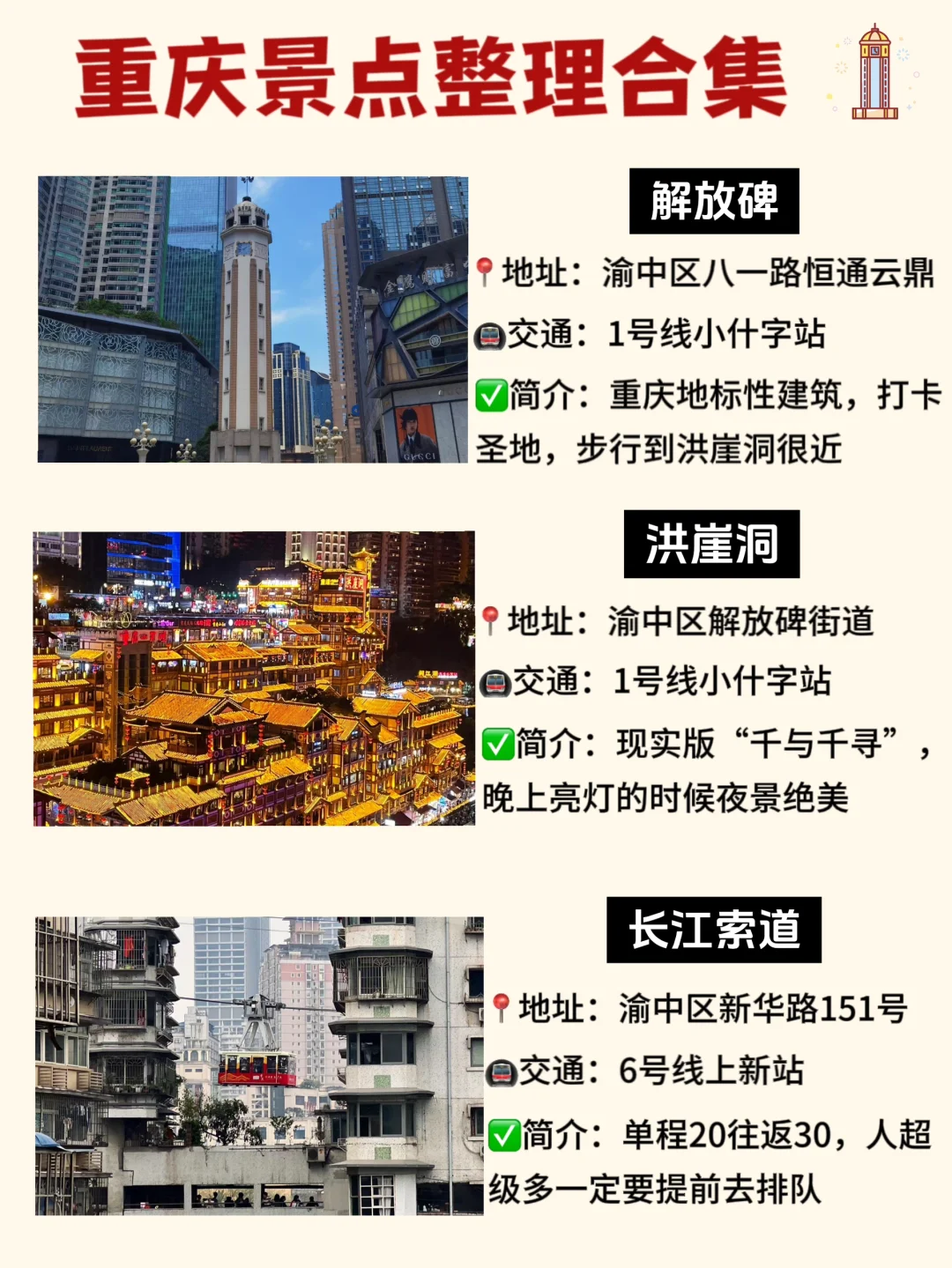 还没来过重庆的姐妹们看过来,为所有来重庆旅游的姐妹整理📝好了重庆旅游攻略,跟着放心游玩吧 — ⭕️重庆三日游路线 🌟第一天:解放碑→八一好吃街→山城步道→白象居→洪崖洞→千厮门大桥 🌟第二天:三峡博物馆→鹅岭二厂→李子坝轻轨→观音桥好吃街→北仓文创园→九街 🌟第三天:重庆动物园→钟书阁→磁器口→烈士墓→渣滓洞→罗中立美术馆