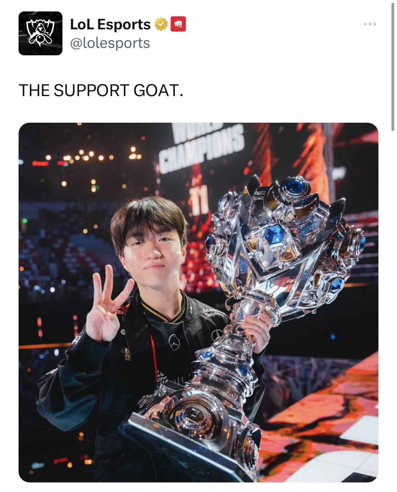虎扑11月10日讯LOL官推晒Keria捧杯照并配文:辅助位的GOAT