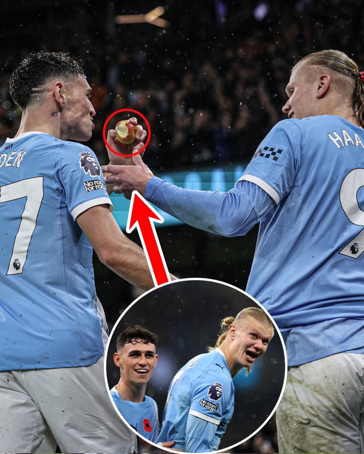 据ESPN报道,多库在比赛中破门之后,哈兰德和福登吃苹果庆祝进球。