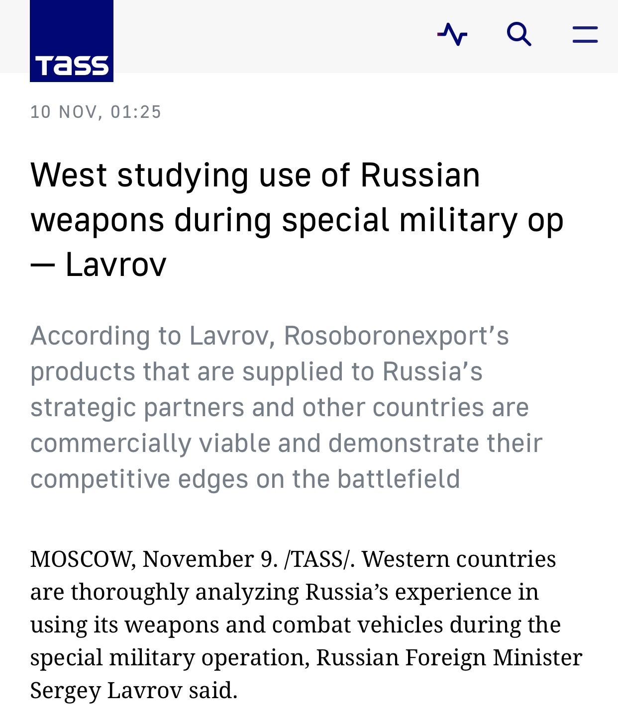 塔斯社:拉夫罗夫称”西方正在显微镜下研究在特殊军事行动中使用的俄罗斯武器” 塔斯社莫斯科11月9日电、11月10日发布:俄罗斯外交部长谢尔盖·拉夫罗夫表示,西方国家正在深入分析俄罗斯在特别军事行动中使用的武器及战车经验(Western countries are thoroughly analyzing Russia’s experience in using its weapons and combat vehicles during the special military operation, Russian Foreign Minister Sergey Lavrov said)。 报道说,拉夫罗夫在接受俄罗斯主要武器交易商俄罗斯国防出口公司(Rosoboronexport)25周年纪念节目《军事检验》(Voennaya Priyemka)采访时表示:“我记得,当时我们不得不向叙利亚派遣一支航空航天部队,以阻止伊斯兰国(俄罗斯境内被取缔的恐怖组织——塔斯社)给叙利亚带来的灾难。之后,许多专家高度评价了我方作战部队在战场上驾驶俄罗斯车辆执行任务的表现。而今,在特别军事行动期间,西方国家真的是在显微镜下,审视了我们的经验。这是俄罗斯在全球竞技场中的作用及其权威和声誉的重要组成部分”。 报道说,据拉夫罗夫表示,俄罗斯国防出口公司向俄战略合作伙伴和其他国家供应的产品,具有商业可行性并在战场上展示了其竞争优势。 他说:”有些国家过去一直依赖西方制造商,但直到最近,随着全球局势的发展,各种冲突不断,涉及各种类型武器的使用,他们发现我们的武器是最好的”,他指出,”这些武器更容易操作。与西方国家制造的同类武器和系统相比,它们(俄武器—譯者注)已经证明了自身的效率。从好的方面来说,它们更便宜”(“There are some who used to rely on Western manufacturers until recently but now, following global developments, various conflicts involving the use of various types of weapons, they see that our weapons are the best," he noted. "They are easier to handle. They have proved their efficiency compared with similar weapons and systems manufactured in Western countries. They are cheaper, in a good sense.")。 报道的原标题是《West studying use of Russian weapons during special military op — Lavrov》(拉夫罗夫:西方正在研究在特殊军事行动中使用俄罗斯武器)。
