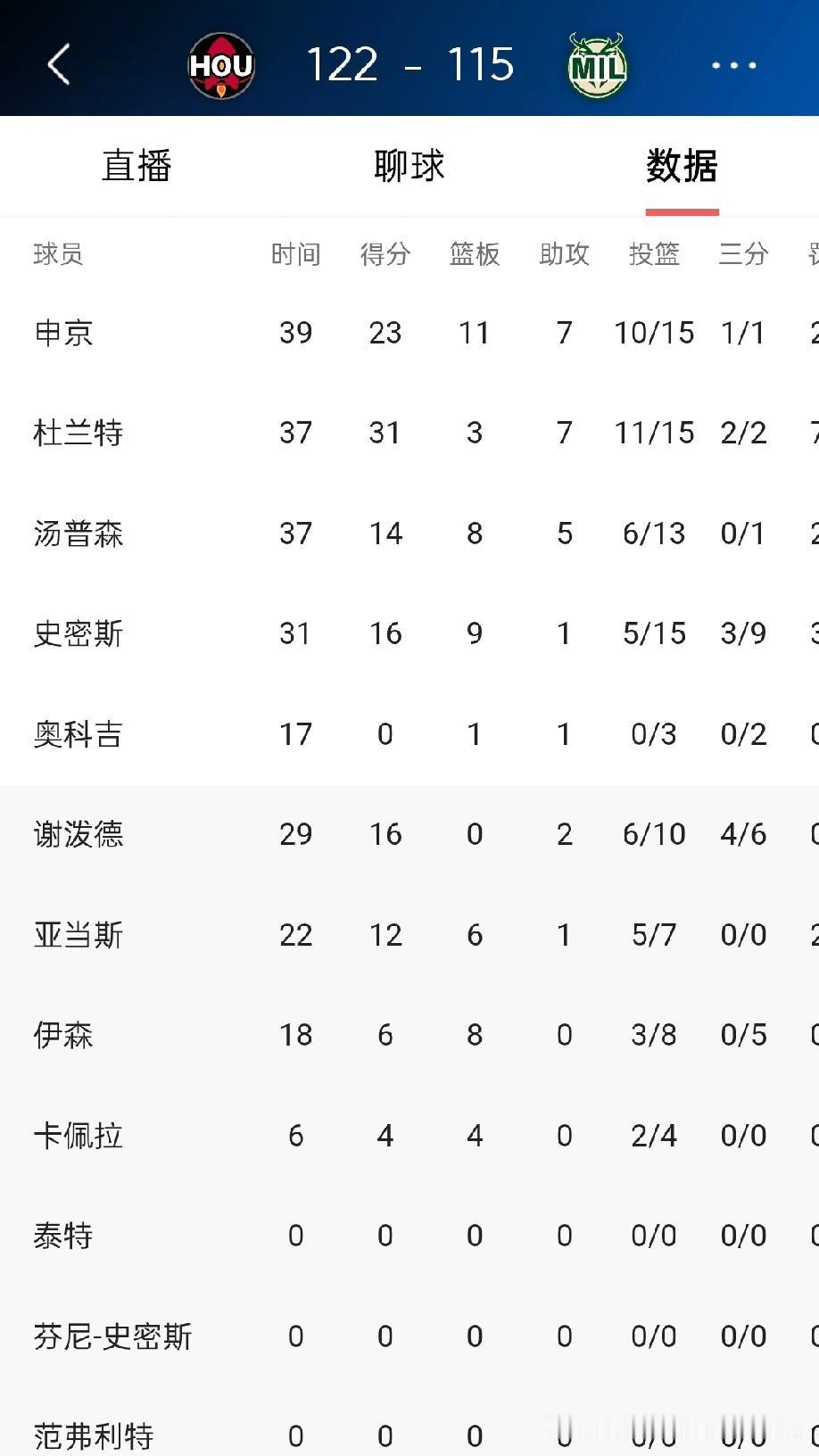 恭喜火箭122-115拿下雄鹿,本场比赛除了杜兰特的稳定发挥,还有申京的关键时刻造成特纳犯规打成2+1,本场比赛谢波德也得到了很大的成长。恭喜火箭,加油。