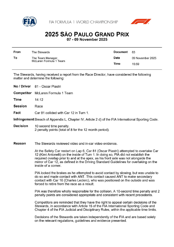 因此,皮亚斯特里对该次碰撞负全部责任。赛事仲裁认为,罚时10秒并超级驾照扣2分的决定是恰当的,且与近期判例保持一致。”
