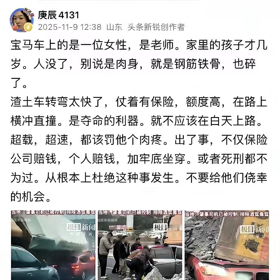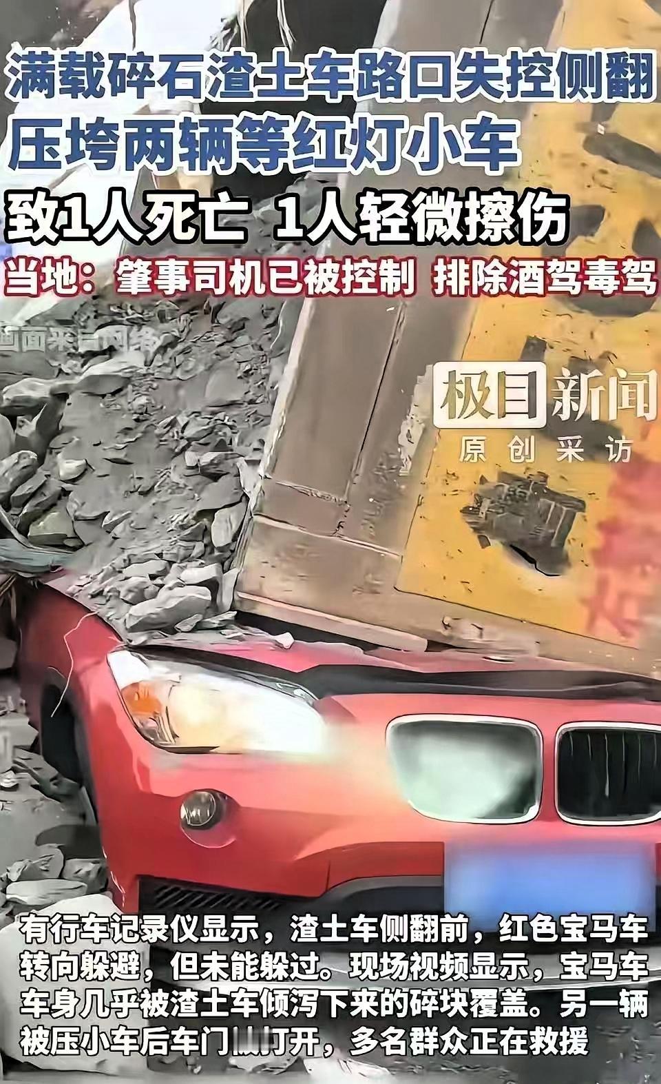 飞来横祸,躺着也中枪。 烟台一女子,据悉是一名教师,孩子还小,才几岁大。 她是个老师,车里还坐着才几岁的孩子,开着红色宝马正常在路面行驶,左边一辆渣土车毫无征兆就侧翻了。 换作谁,第一反应都是躲啊,她本能地往右打方向盘,可前后都跟着车,路面挤得满满当当,根本没地方冲出去。就那么一两秒的功夫,渣土车的翻斗带着满满一车石头砸了下来,好好的车瞬间被砸得变了形,她再也没能醒过来,想想孩子当时在车里的无助,真的太让人心疼了。 事后总有人说“当时要是踩脚油门追尾前车,说不定就能躲开”,可这话真的太轻巧了。咱们都是普通人,不是赛车手,真到了那生死一线的瞬间,脑子一片空白,手忙脚乱都是本能,哪有时间冷静分析“踩油门还是踩刹车”? 那种时候,能做出反应就不错了,没人能预知意外,更没人能在慌乱中算准最优解,这种“事后诸葛亮”的话,说了也白说。 其实咱们开车,最该学的不是“出事了怎么救”,而是“怎么从一开始就别出事”。平时见着渣土车、大货车这种“大家伙”,别跟它们抢道,别跟它们并排走,也别跟在后面太近——与其指望出事时能“完美避险”,不如从根上远离风险。 “明天和意外哪个先来”,这话听了无数次,总觉得离自己很远,可每次看到这种事,才知道有多真实。好好活着从来不是一句空话,是出门前给家人说句“我走了”,是开车时见着大车就主动放慢速度、拉开距离,是哪怕多等一个红灯,也不抢那几秒钟。因为你不知道,你多一分小心,就是给家人多一分安心,家里还有人等着盼着你平安回来。 愿这位妈妈一路走好,孩子能被好好照顾。