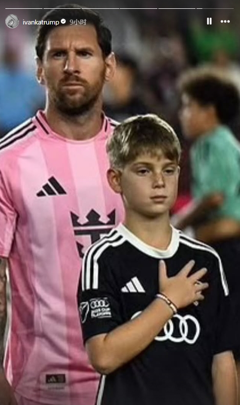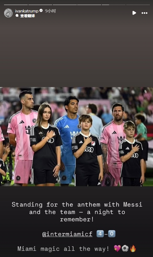 伊万卡的三个孩子是梅西、布斯克茨、诺沃本场的球童,伊万卡在社媒晒出照片写道:与梅西和球队站在一起听着奏国歌,难忘之夜!迈阿密4-0,迈阿密魔力一路闪耀。