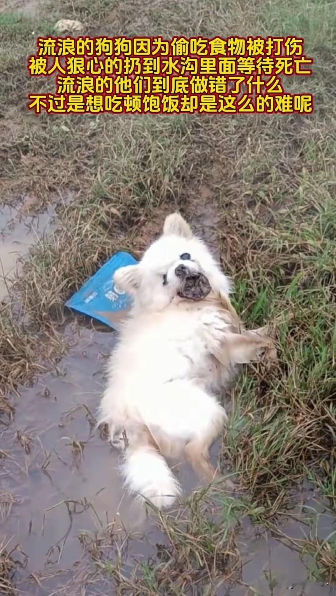 流浪狗偷吃晾在院子里的腊肉被屋主暴打一顿后抛在水沟里无法动弹。这只大白狗看起来应