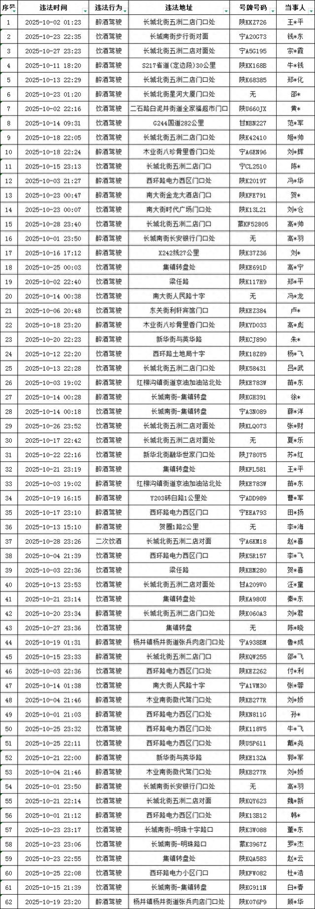 为进一步净化道路交通环境,严厉打击酒驾、醉驾等严重交通违法行为,有效预防和减少因酒驾醉驾导致的道路交通事故,定边县公安局交警大队持续保持高压整治态势,常态化开展酒驾醉驾集中查处行动,查处行动覆盖城市主干道、餐饮娱乐场所周边道路、城乡结合处及农村重点路段,采取定点设卡与流动巡逻相结合的方式,实现全时段、全覆盖管控,切实保障人民群众生命财产安全。10月份大队查处酒驾醉驾违法行为62起,现进行集中曝光。