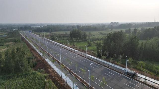 前一日的降雨将长白山路洗刷得格外整洁,黑色沥青路面在阳光下泛着均匀的光泽,交通标线清晰,车辆驶过几乎无颠簸声,两侧新栽种的草木为这条交通主动脉增添了几分生机。长白山路南延工程作为全市重点民生工程,北起新城榴园大道,南至郯薛路,全长2.2千米,按城市主干路标准设计,双向六车道,设计时速60千米/小时。工程包含道路、桥梁、交通设施、排水、照明、绿化、电力土建及通信等配套系统。
