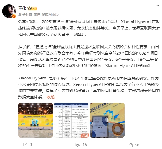 11月10日,小米集团公关部总经理王化在微博发文称,2025“直通乌镇”全球互联网大赛传来好消息,XiaomiHyperAI在智能终端领域的卓越表现获得认可,荣获该赛道特等奖。