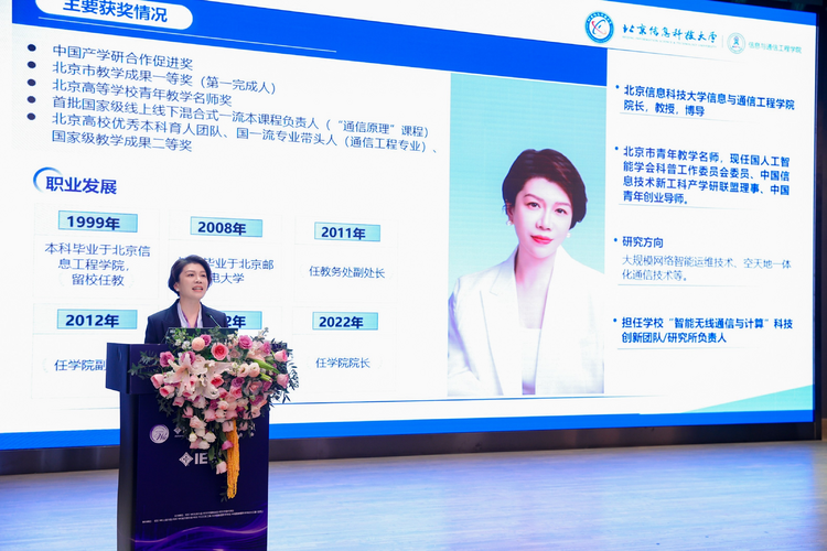北京信息科技大学信息与通信工程学院院长、北京市优秀人才和青年拔尖人才李学华教授带来题为“AI时代女性领导力的多维体现:科学研究与高等教育领域的创新发展”的主旨报告。她介绍了自己的职业生涯,指出女性的亲和力、共情力和坚韧力在教育和管理中的独特优势,并分享如何将团队的研究前沿进展转化为教学资源和实际应用。