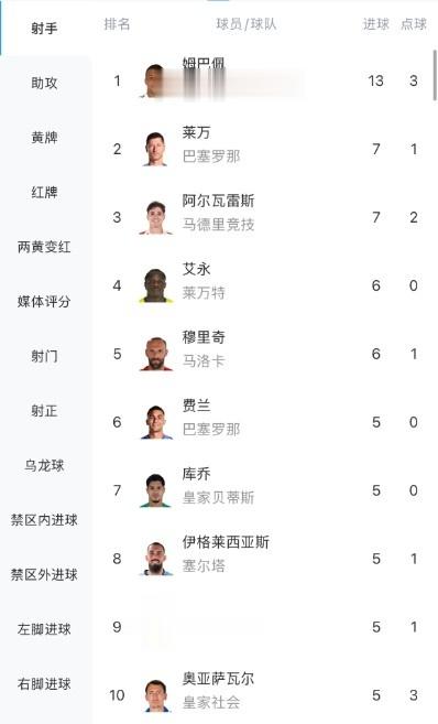 射手榜方面,姆巴佩13球排名第一,莱万、阿尔瓦雷斯7球分居二三位,艾永、穆里奇打进6球排在第四和第五位,费兰、库乔、伊格莱西亚斯、维尼修斯、奥亚萨瓦尔打进5球。