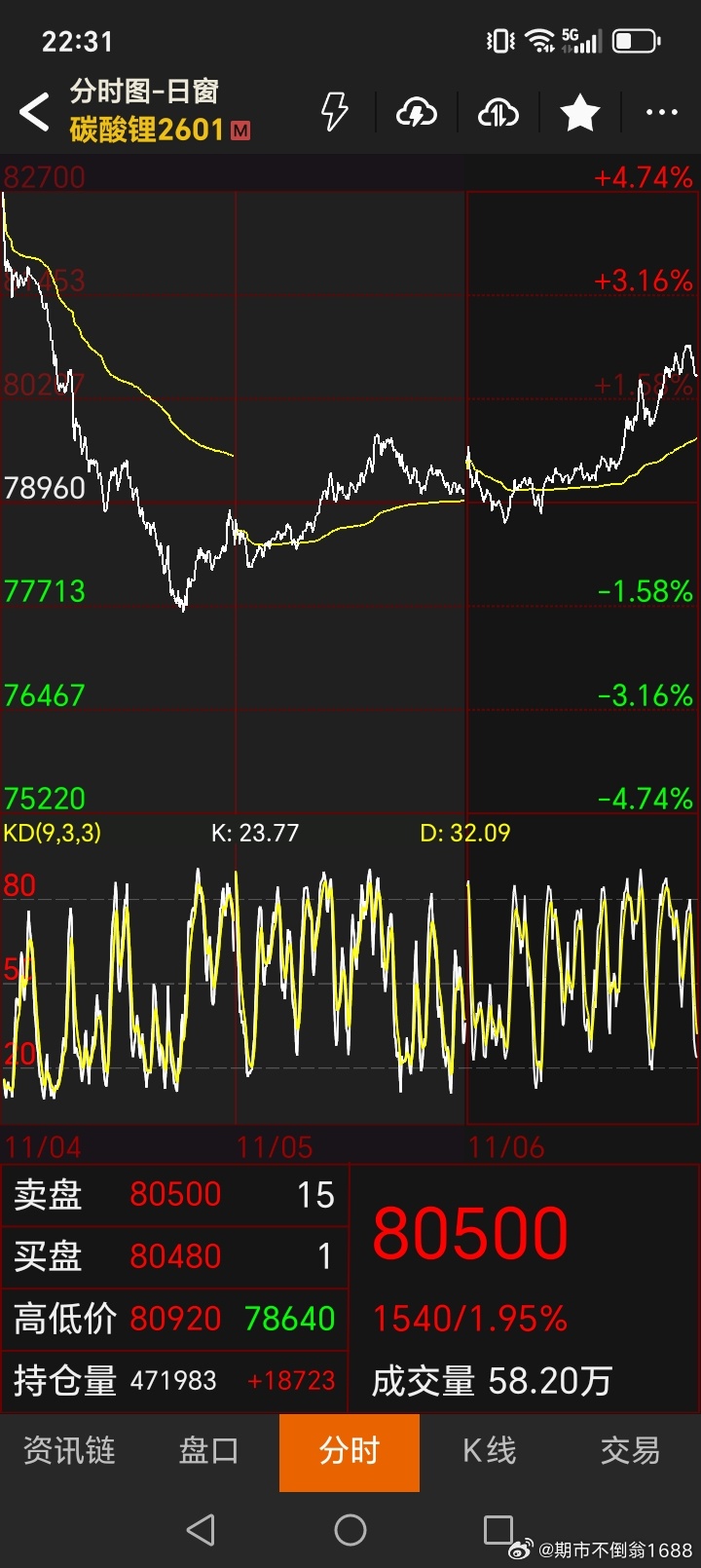 碳酸锂我是11月4号上午全部平仓的,下午最低跌到77580,收盘在78560。按正常走势,盘中跌了百分之五点几,收盘跌了百分之四点,第二天应该继续往下调整个一两千点,但是第二天反而跳空高开了一点,翻红了,所以我进了第一次2手底仓。今天继续向上,这个点位多空双方都不可能轻易撤退,可能会震荡向上,这是我个人判断,所以按这个判断我今天又加了三手,看未来几个交易日多头能不能把11月4日的大阴线给吃了,如果吃了一路向北的可能性就会大很多,如果吃不掉再震荡下行,那一路向北调整的级别就会大很多。