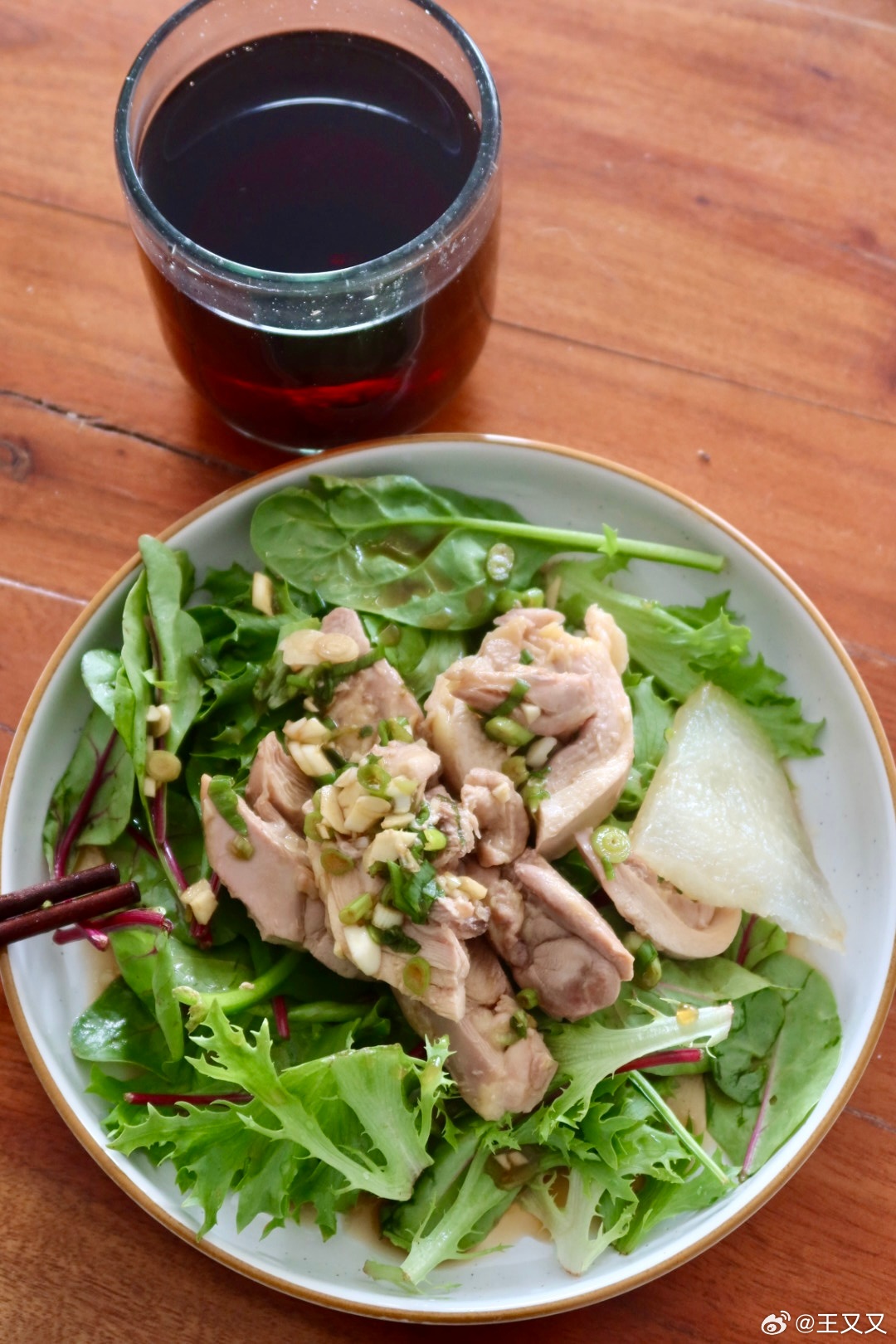 午餐:葱油鸡沙拉🥗,蒸鸡腿肉的时候加了两块冬瓜增加点鲜味。金银花菊花决明子蒲公英根桑叶菊苣根牛蒡根茯苓桑葚黄精茶🍵直接买的一盒一盒装好的茶,味道很舒适,每天煮上两壶,补充够好喝的水分