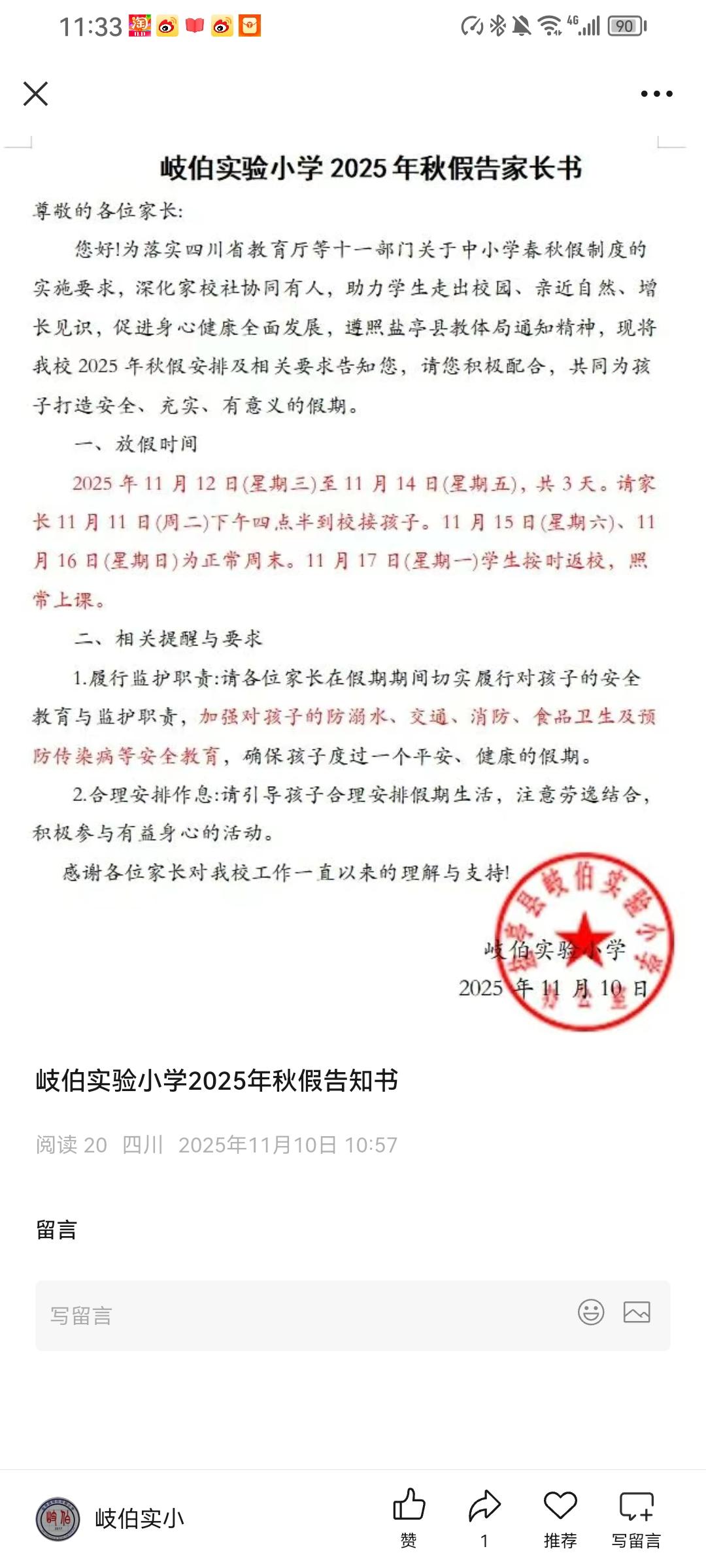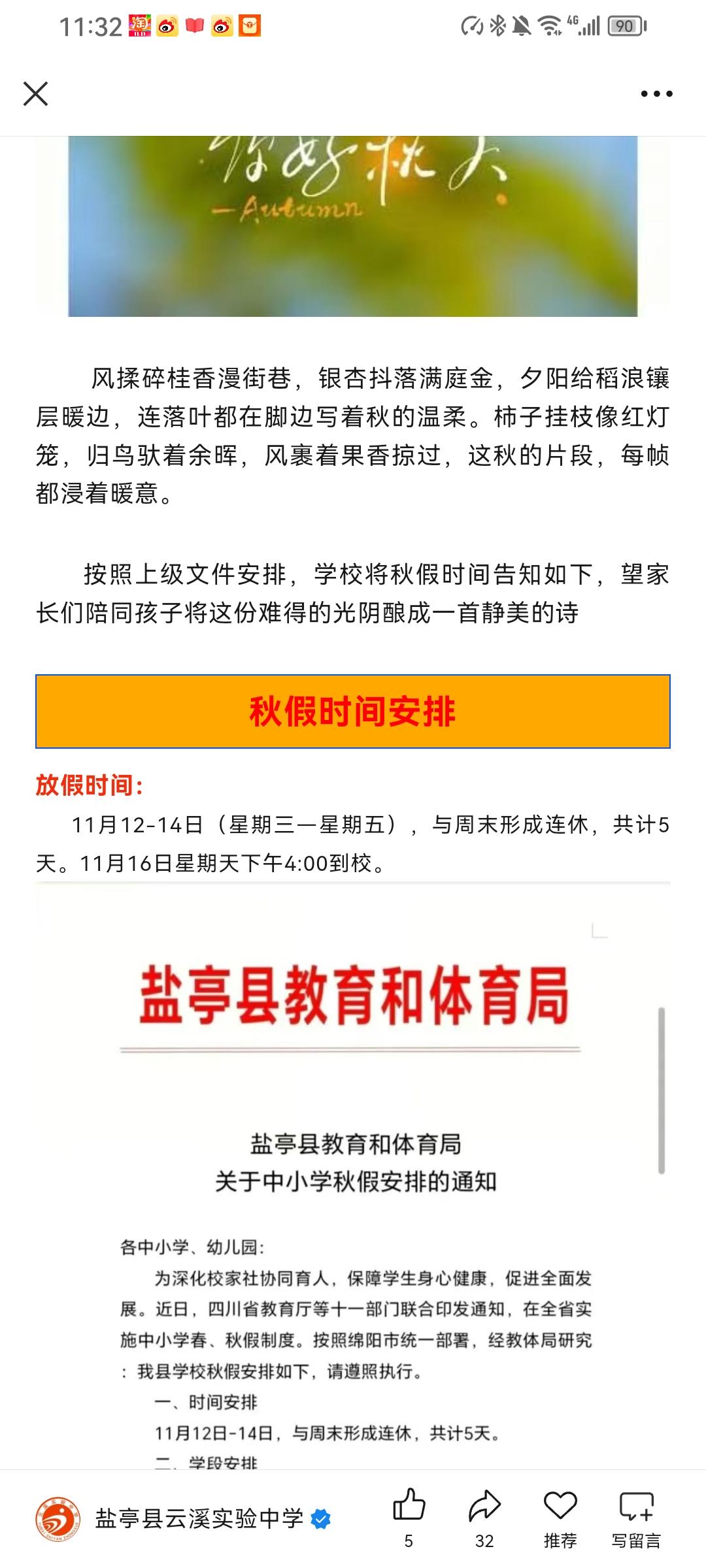 云溪小学、云溪实验中学、岐伯实验小学秋假放假通知四川秋假 绵阳秋假