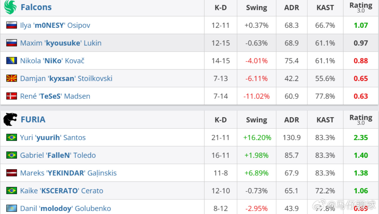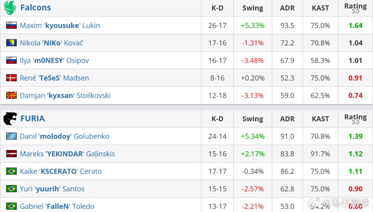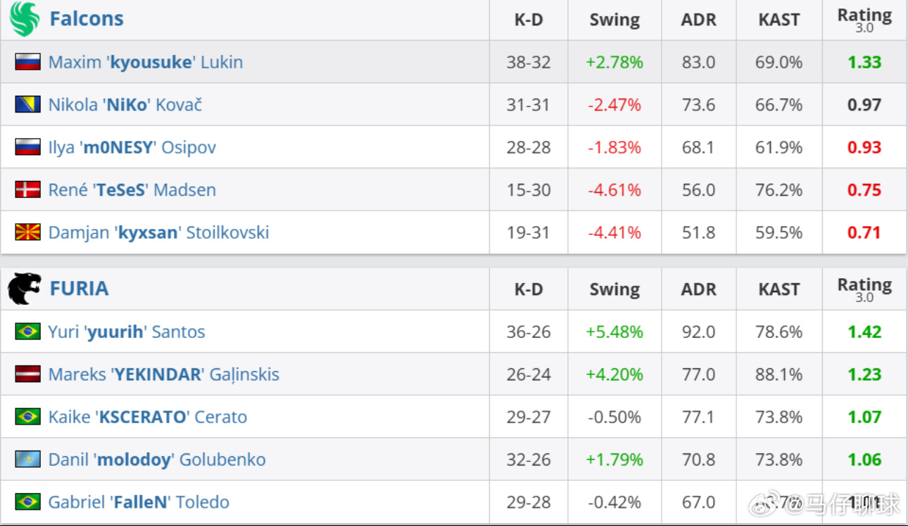 数据方面,yuurih爆砍惊人的2.35rt;而Falcons这边则全员发挥不佳,仅m0NESY一人拿到1.07rt。