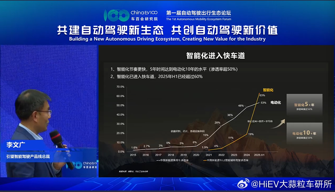 他表示,与电动化相比,智能化节奏更快,电动化渗透率接近 50% 用了10年时间,而智能化达到这一水平仅用 5 年时间。
