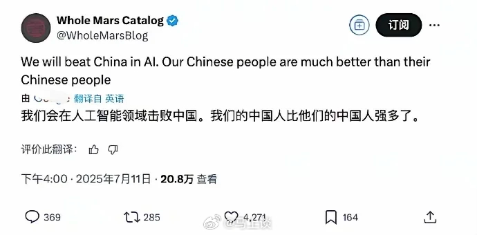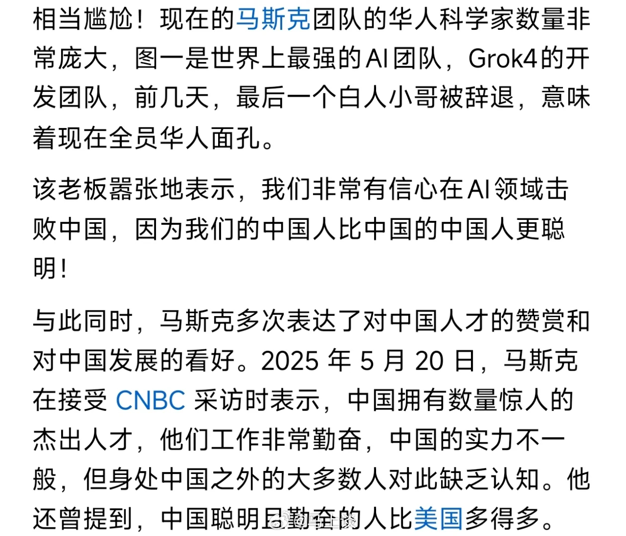 传闻马斯克Grok4开发团队辞退了最后一个白人,变成了全华班。这让我想起之前美国硅谷投资者的一句话:“我们会在人工智能领域击败中国。我们的中国人比他们的中国人强多了。”