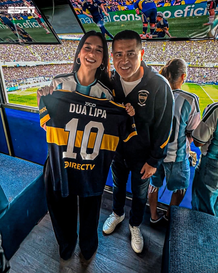 正在阿根廷布宜诺斯艾利斯举行演唱会的啪姐DuaLipa现场观战博卡青年vs河床的比赛,身着阿根廷最新国家队战袍,并与里克尔梅合影。