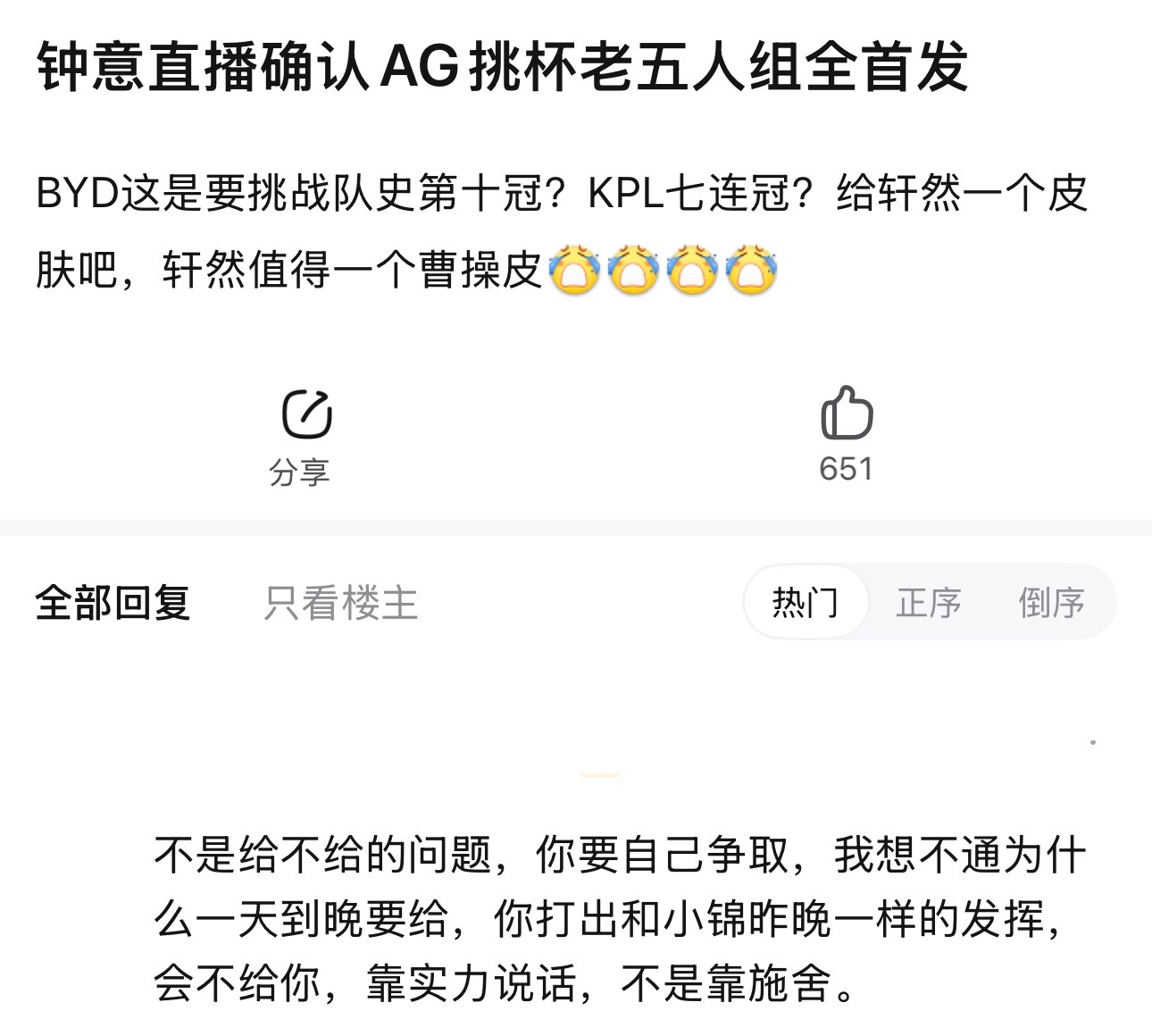 kpl 钟意直播确认AG挑杯老五人组全首发