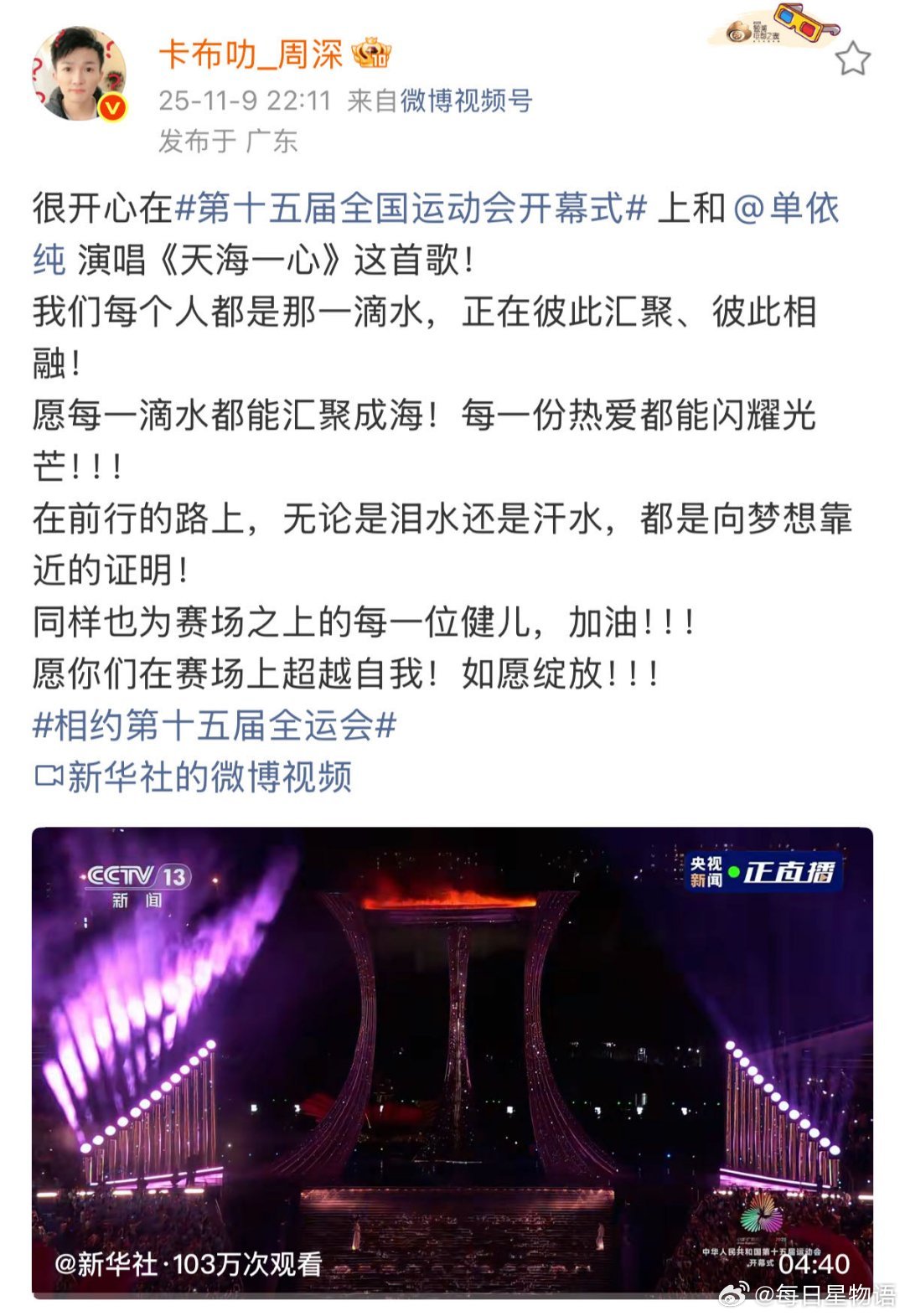 周深回应参加全运会开幕式 周深在全运会开幕式后发文,分享演唱《天海一心》的感受。