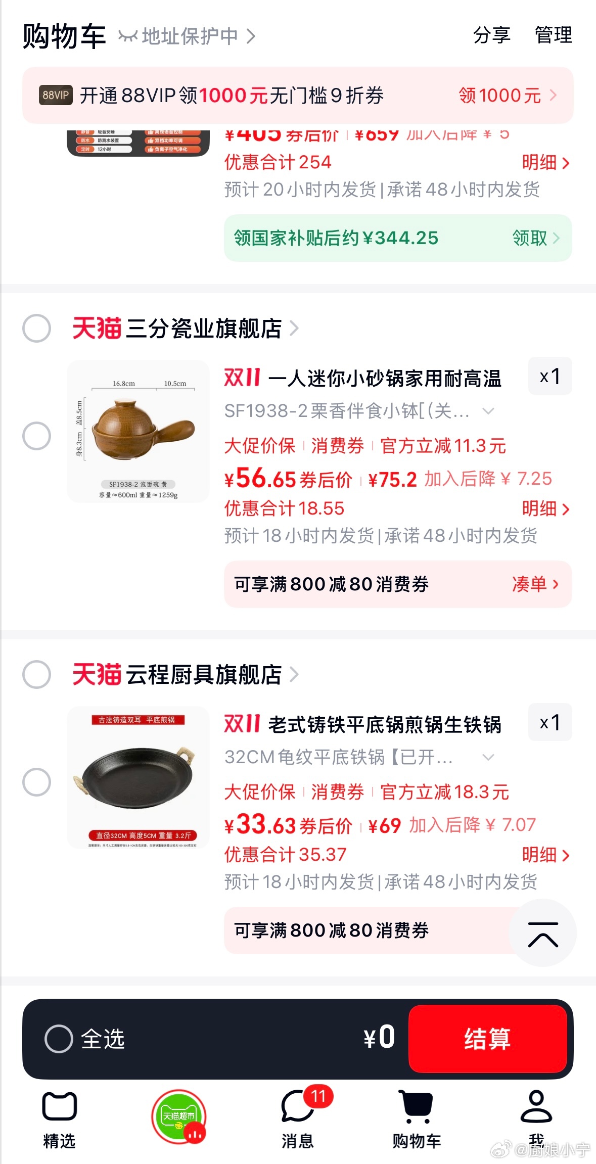 你们可以先把心仪商品放入购物车🛒,店铺优惠券,品类福利券,满减,消费券🧧,再叠加88VIP折扣,看好几件商品一起下单能拿到最划算,比如800档位,就争取凑到八百零几这样子。